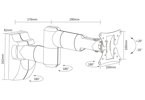 LCD-503 Κατάλληλη για τηλεοράσεις LCDκαι TFT από 13" ως 27". Μέγιστο βάρος φορτίου 30Kg. Συμβατή με VESA 50x50, 75x75, 100x100. Πλήρης ελευθερία οριζόντιας περιστροφής του κάθε βραχίονα (δείτε αναλυτική φωτογραφία). Επιτρέπει επίσης την περιστροφή και στον κάθετο άξονα, με μέγιστη κλίση ±20 μοιρών. Απλή και εύκολη στην εγκατάσταση. Εξαιρετική ποιότητα κατασκευής. Διαθέτει επίσης και σύστημα διαχείρισης καλωδίων εντός του άξονα της βάσης.