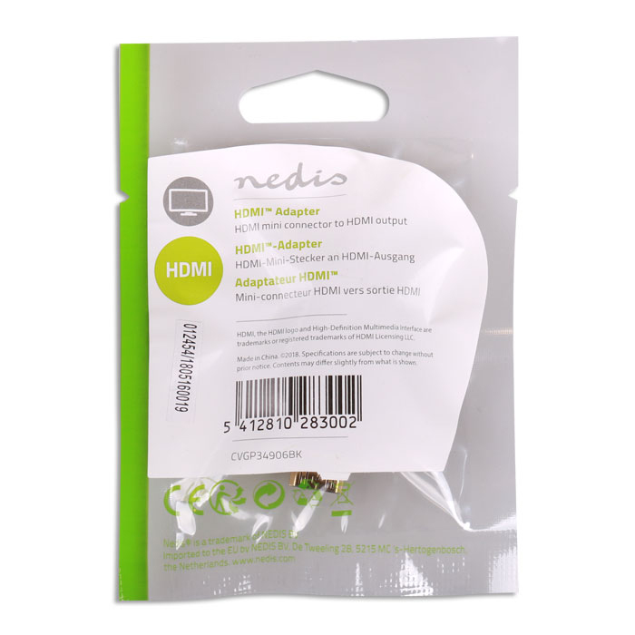 Αντάπτορας HDMI θηλυκό σε mini HDMI αρσενικό της NEDIS, CVGP34906BK. HDMI αντάπτορας που μετατρέπει ένα κανονικό HDMI βύσμα σε βύσμα mini HDMI.