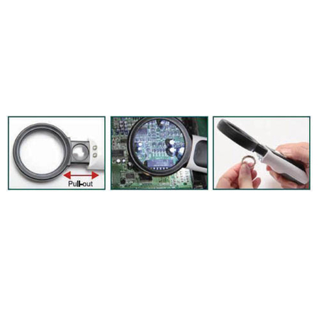 Φωτιζόμενος Μεγεθυντικός Φακός Χειρός ZOOM X3.5 / X20 της ProsKit, MA-023. Διαθέτει φακό με διάμετρο Φ50mm X3.5, φακό Φ18mm X20 (κρυφός - συρόμενο καπάκι) και διακόπτη on/off για την ενεργοποίηση βοηθητικού φωτισμού. Λειτουργεί με μπαταρίες 2 x AAA (δεν περιλαμβάνονται).