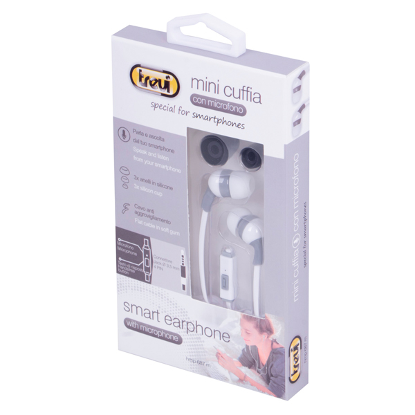 Ενσύρματα Ακουστικά Handsfree σε Λευκό-Γκρί της TREVI, HMP 687 M-WG. Με πλήκτρο απάντησης ενώ διαθέτουν επίπεδο καλώδιο 1.2m που δεν μπερδεύεται και βύσμα Jack 3.5mm το οποίο είναι συμβατό με τα περισσότερα smartphones, tablet και συσκευές ήχου της αγοράς. Περιλαμβάνει 3 σετ μαξιλαράκια ακουστικών διαφόρων μεγεθών για καλύτερη εφαρμογή.