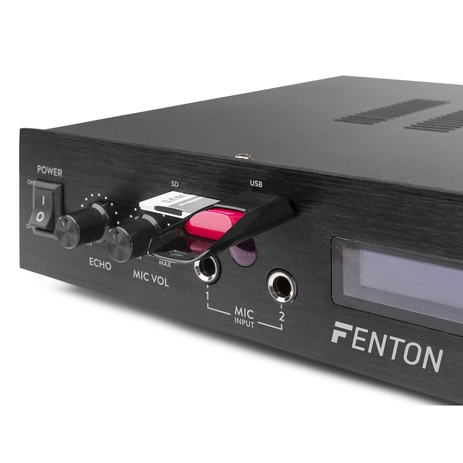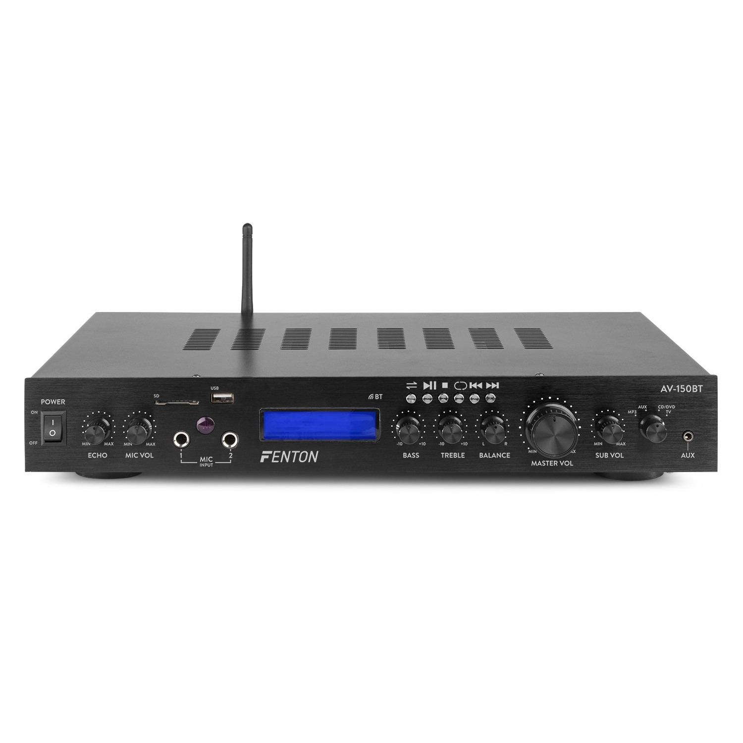 FENTON AV-150BT Karaoke ενισχυτής 5 καναλιών ισχύος 2x 100Watt + 3x 60Watt με ενσωματωμένο δέκτη ραδιοφώνιου FM, Bluetooth και MP3 Player μέσω USB και SD card. Επιπλέον διαθέτει 2x εισόδους μικροφώνου 6.3mm για να τραγουδάτε πάνω στο αγαπημένο σας κομμάτι μαζί με τους φίλου σας.
