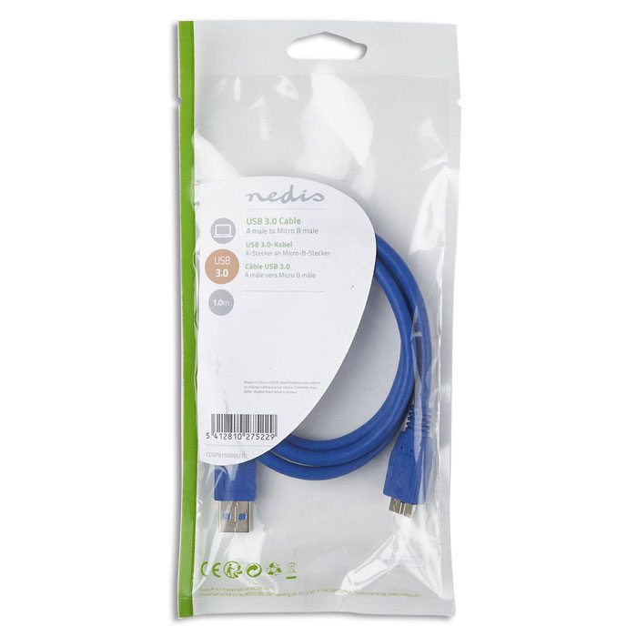 Καλώδιo USB 3.0 A αρσ. - USB micro B αρσ. 1m της NEDIS, CCGP61500BU10. Καλώδιο σύνδεσης κατάλληλο για τους περισσότερους εξωτερικούς σκληρούς δίσκους που κυκλοφορούν στην αγορά. Μήκος 1m.