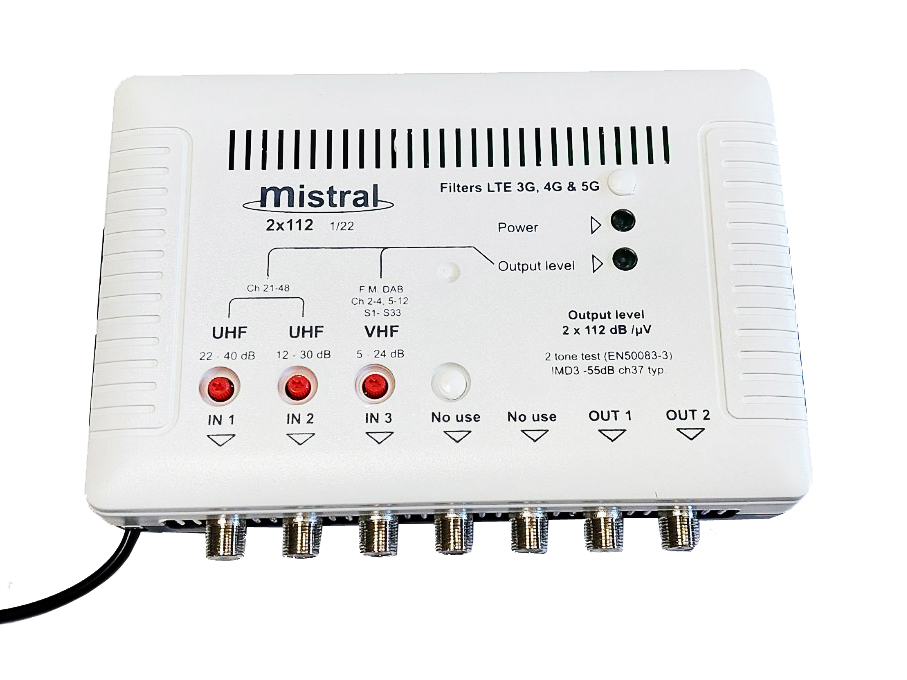 MISTRAL 2x112-5G Ενισχυτής κεντρικής κεραίας πολλαπλών εξόδων με ενσωματωμένο φίλτρο LTE (5G). Διαθέτει δύο ανεξάρτητους ενισχυτές VHF και UHF για λιγότερη ενδοδιαμόρφωση, όπως επίσης και ξεχωριστό LED VHF - UHF για ένδειξη αυξημένης ενδοδιαμόρφωσης. Η εξασθένηση γίνεται με ρυθμιστικά ποτενσιόμετρα έως - 18 dB. Ενίσχυση VHF 24dB / UHF 40dB / UHF 30dB. Όλες οι συνδέσεις είναι με τύπου F connectors.