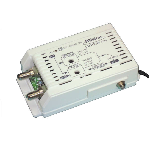 MISTRAL L1x112-40 5G Ενισχυτής κεντρικής κεραίας 1 εξόδου με ενσωματωμένο φίλτρο LTE 5G (3G/4G/5G). Αυτός ο ενισχυτής έχει μία είσοδο UHF και μία ξεχωριστή είσοδο μόνο για VHF με ανεξάρτητη ρύθμιση για να συνδεθεί σαν ενισχυτής κεντρικής.