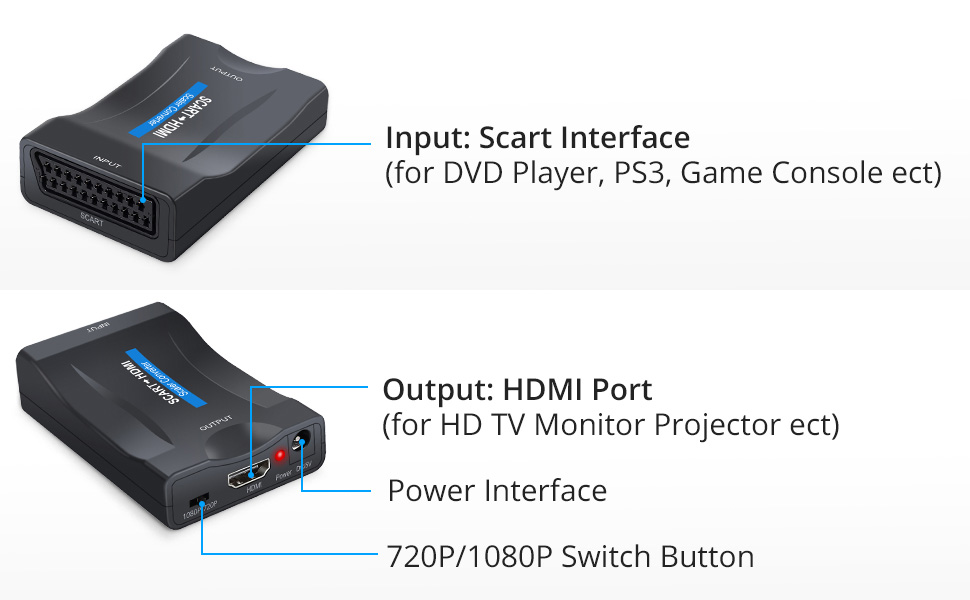 Στην έξοδο της ψηφιακής εικόνας HDMI υποστηρίζει έκδοση HDMI1.4 και μας παρέχει δυνατότητα επιλογής ανάλυσης σήματος εξόδου: 720p/1080p μέσω διακόπτη. Λειτουργεί με τροφοδοσία 5V DC (περιλαμβάνει τροφοδοτικό πρίζας). Εύκολο στην χρήση με λειτουργία Plug & Play. Διαθέτει ενδεικτική λυχνία λειτουργίας LED. Σημειώστε πως δεν περιλαμβάνει καλώδια συνδέσεων HDMI και Scart, οπότε φροντίστε για την προμήθεια τους, αν δεν τα έχετε ήδη.