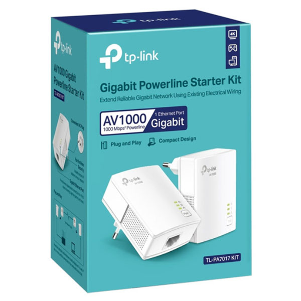 Powerline Adapter Starter Kit 1000Mbps της TP-LINK, TL-PA7017KIT AV1000. Μετατρέψτε οποιαδήποτε πρίζα ηλεκτρικού του σπιτιού σας σε κάρτα δικτύου ταχύτητας ως 1000Μbps. Το PA7017KIT σας δίνει την δυνατότητα να συνδέσετε τους υπολογιστές σας ή άλλες συσκευές δικτύου στην υπάρχουσα ηλεκτρική εγκατάσταση του σπιτιού σας και να δημιουργήσετε ένα τοπικό δίκτυο δίχως την χρήση νέας καλωδίωσης. Πάρα πολύ απλό στην χρήση του, με σταθερή και μακροχρόνια εγγυημένη απόδοση.