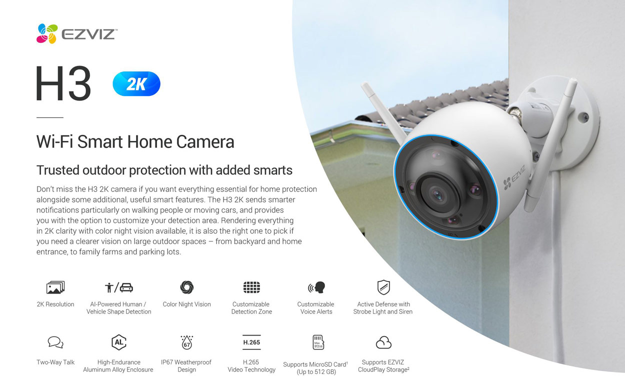 EZVIZ H3 2K (CS-H3-R100-1H3WKFL) - Ασύρματη - Ενσύρματη δικτυακή WiFi IP κάμερα Bullet 3MP (2K), αδιάβροχη, με βαθμό στεγανότητας IP67 ώστε να είναι κατάλληλη για εξωτερικούς χώρους. Διαθέτει αισθητήρα 1/2.7” Progressive Scan CMOS μέγιστη ανάλυσης 3Mpixes (2K), 2304 × 1296 pixels @ 25fps και σταθερό ευρυγώνιο φακό 2.8mm με μεγάλη γωνία οριζόντιας θέασης 106° και χαμηλή ευαισθησία 0.01 Lux @ F2.0 (AGC On). Διαθέτει ενσωματωμένο Wi-Fi 2.4 GHz για ασύρματη σύνδεση στο δίκτυο, με 2 ενσωματωμένες κεραίες WiFi για ακόμα καλύτερη λήψη, ωστόσο υποστηρίζει και ενσύρματη σύνδεση μέσω Ethernet σε περίπτωση που αυτό σας εξυπηρετεί καλύτερα.