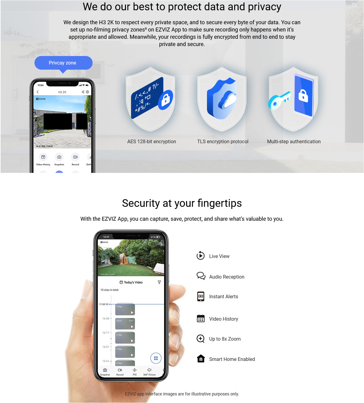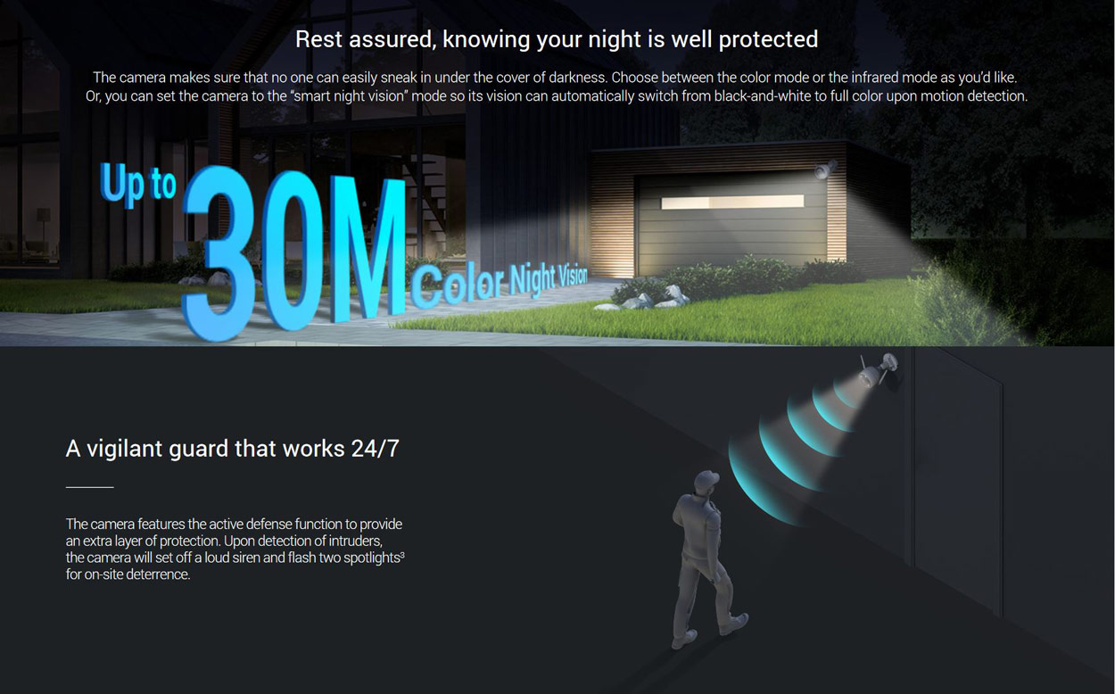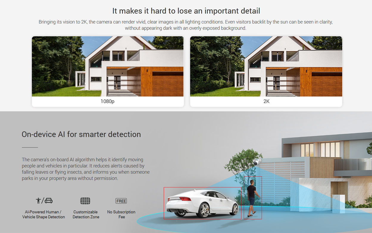 Υποστηρίζει συμπίεση Video H.265 για ταχύτερη μετάδοση στο δίκτυο και μεγαλύτερους χρόνους καταγραφής. Διαθέτει ενσωματωμένο μικρόφωνο και μεγάφωνο, προσφέροντας αμφίδρομη ηχητική επικοινωνία. Η κάμερα χρησιμοποιεί αλγορίθμους τεχνητής νοημοσύνης AI-Powered Human / Vehicle Shape Detection για αναγνώριση κίνησης από ανθρώπους ή/και αυτοκίνητα, με δυνατότητα ενεργοποίησης strobe light και αναπαραγωγής customized ηχητικών μηνυμάτων σε περίπτωση συναγερμού (ανίχνευσης κίνησης). Υποστηρίζει επίσης Alexa και Google Assistant.