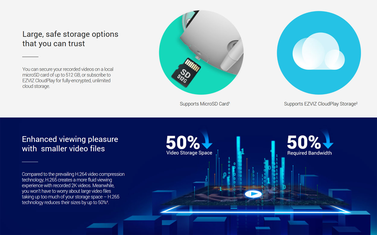 Φυσικά διαθέτει και την απαραίτητη υποδοχή κάρτας μνήμης MicroSD (ως 512 GB - η κάρτα δεν περιλαμβάνεται) για τοπική καταγραφή video. Παρέχει ωστόσο την δυνατότητα καταγραφής σε cloud ή σε NVR,
