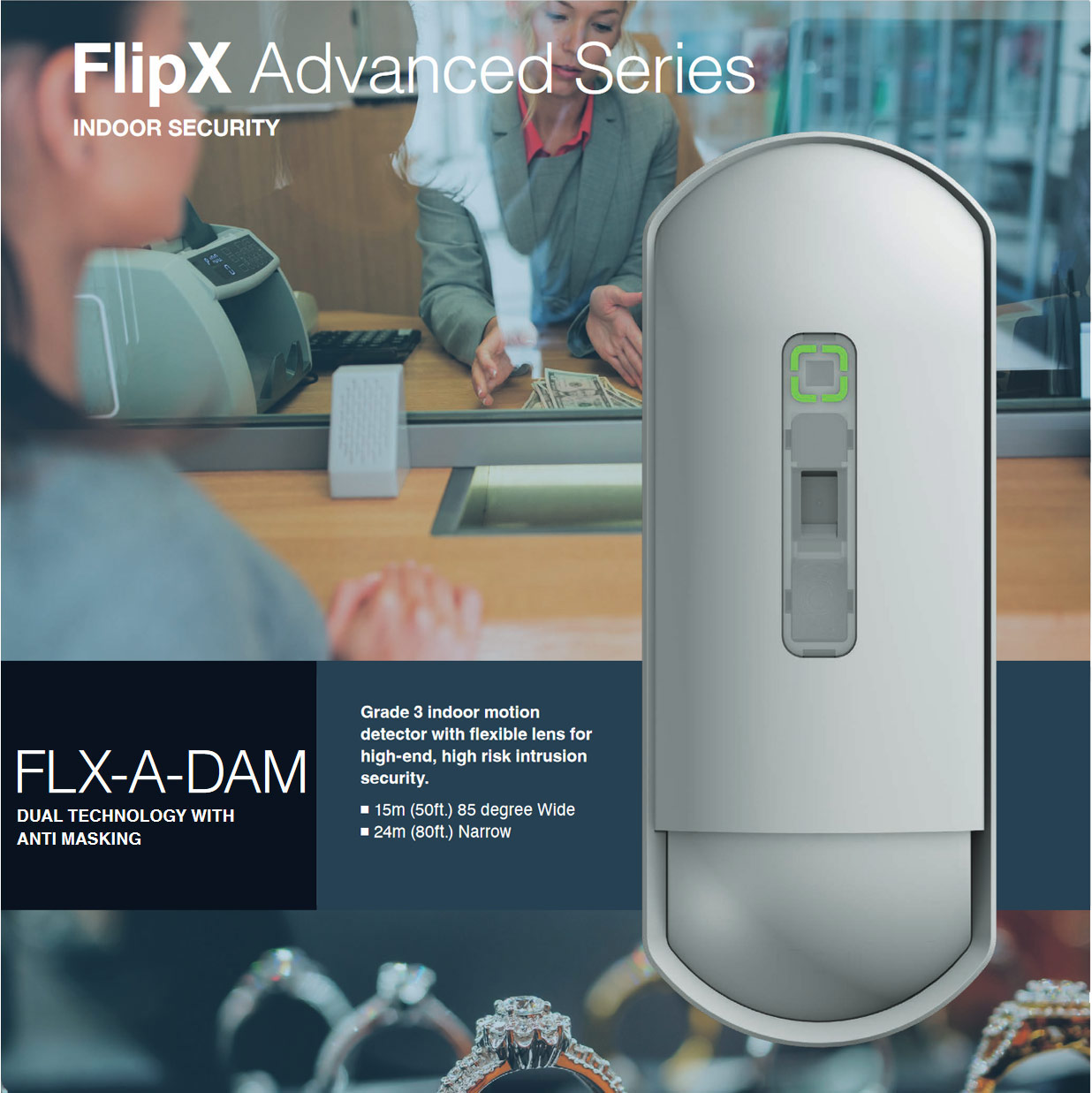 Μέρος της προηγμένης σειράς FlipX ADVANCED, ο FLX-A-DAM είναι ο πιο πρόσφατος αισθητήρας εσωτερικού χώρου της OPTEX με Grade 3 και Διπλή τεχνολογία μικροκυμάτων και PIR και δυνατότητες αντιμάσκας. Διαθέτει επίσης τον μοναδικό στο OPTEX περιστρεφόμενο φακό για ευρεία και στενή ανίχνευση σε έναν μόνο αισθητήρα. Σχεδιασμένο με γνώμονα τοποθεσίες υψηλής ασφάλειας, το FlipX Advanced έχει εξαιρετική απόδοση σύλληψης και προηγμένες ρυθμίσεις ευαισθησίας για αυξημένη ακρίβεια και αξιοπιστία.