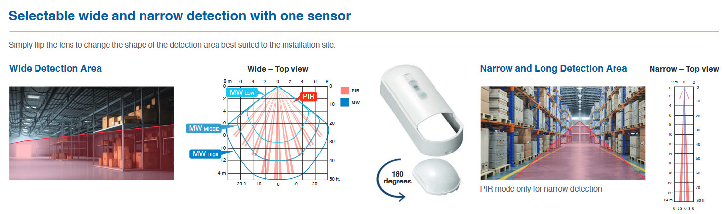 Με την περιστροφή του σφαιρικού φακού κατά 180°, μπορείτε αυτομάτως να αλλάξετε την κάλυψη του ανιχνευτή, από ευρεία, ακτίνας 12 μέτρων και γωνία κάλυψης 85° (76 ζώνες), σε στενή τύπου κουρτίνας, με ακτίνα ανίχνευσης 18m και γωνία κάλυψης μόλις 5° (12 ζώνες). Απλώς αλλάξτε το φακό για να αλλάξετε το το εύρος της περιοχής ανίχνευσης που ταιριάζει καλύτερα στο σημείο εγκατάστασης. Η επιλογή λειτουργίας Wide ή Narrow γίνεται με Jumper στην πλακέτα του ανιχνευτή.