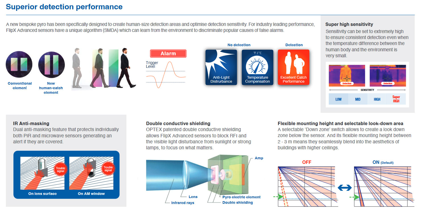 Το νέο πυροηλεκτρικό στοιχείο έχει σχεδιαστεί ειδικά για τη δημιουργία περιοχών ανίχνευσης ανθρώπινου μεγέθους και τη βελτιστοποίηση της ευαισθησίας ανίχνευσης. Για κορυφαίες επιδόσεις στον κλάδο, οι αισθητήρες FlipX Advanced διαθέτουν έναν μοναδικό αλγόριθμο (SMDA) που μπορεί να μάθει από το περιβάλλον να διακρίνει δημοφιλείς αιτίες ψευδών συναγερμών.