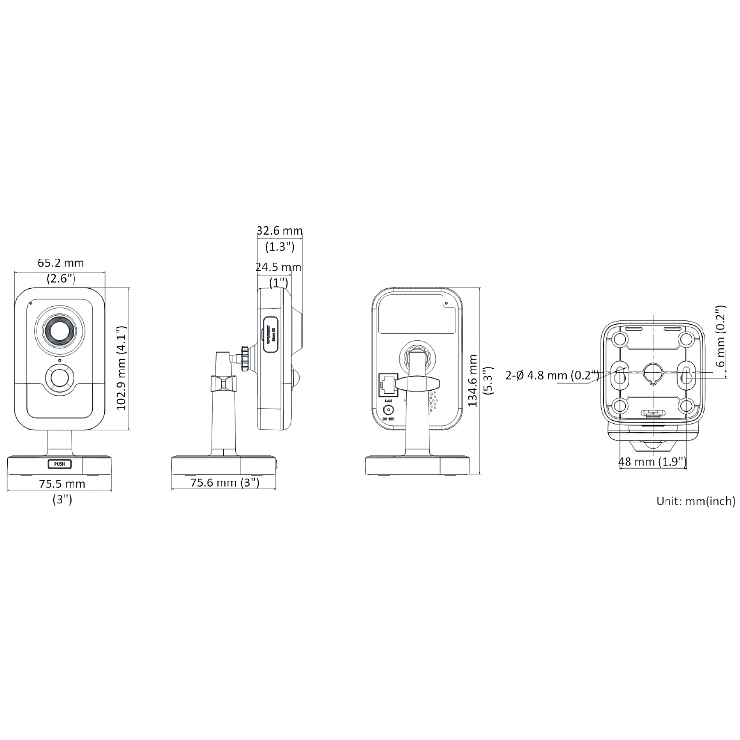 Διαθέτει υποδοχή για κάρτα μνήμη MicroSD ως 512GB για τοπική καταγραφή video. Διαθέτει την δική της βάση στήριξης. Δυνατότητα τροφοδοσίας PoE (802.3af) ή 12 VDC. Κατανάλωση 5W. Διαστάσεις (ΠxBxY): 65.2 x 32.9 x 102.9 mm. Βάρος: ~120γρ