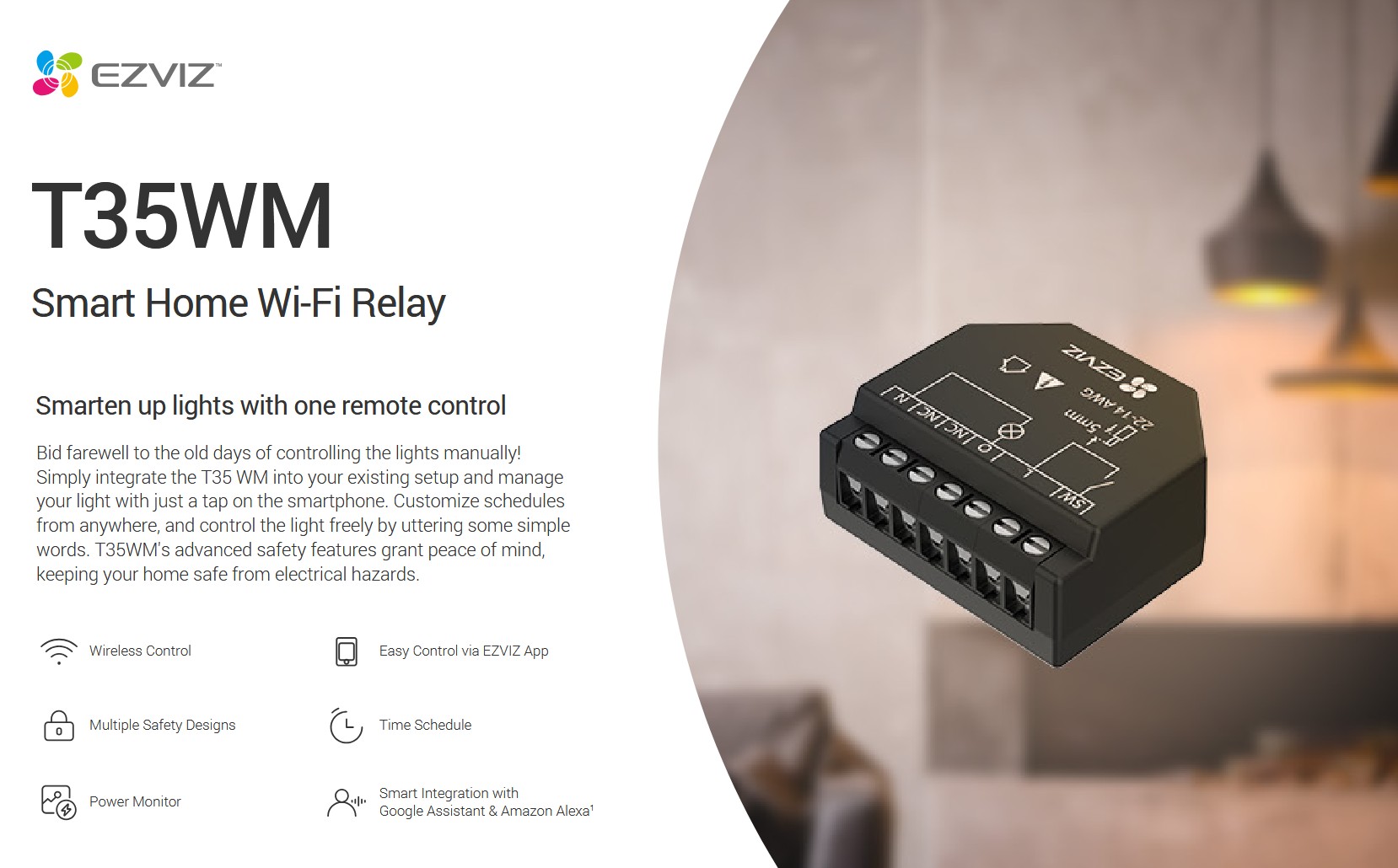 Το EZVIZ T35WM είναι ένα έξυπνο ρελέ Wi-Fi που σας επιτρέπει να αυτοματοποιήσετε τον έλεγχο ηλεκτρικών συσκευών στο σπίτι ή το γραφείο σας. Με απομακρυσμένο έλεγχο μέσω εφαρμογής EZVIZ, δυνατότητα φωνητικών εντολών, παρακολούθηση κατανάλωσης και ενσωματωμένες λειτουργίες προστασίας, αποτελεί ιδανική λύση για σύγχρονες εγκαταστάσεις έξυπνου σπιτιού.