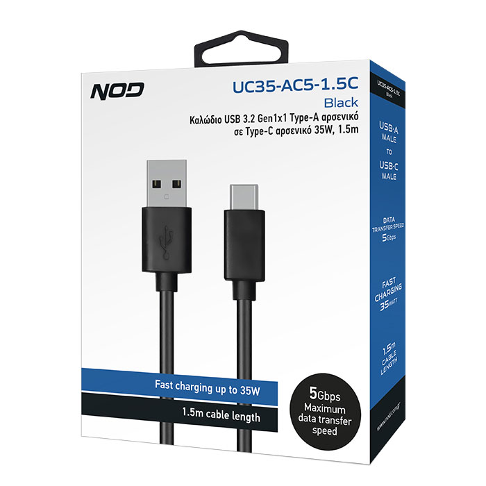 NOD UC35-AC5-1.5C καλώδιo USB 3.2 Gen1x1 Type A σε Type C Super Speed 35W μήκος 1.5m σε μαύρο Χρώμα. Εξασφαλίζουν τη μεταφορά αρχείων και δεδομένων επιτυγχάνοντας υψηλές ταχύτητες, χωρίς λάθη κατά τη μετάδοση.
