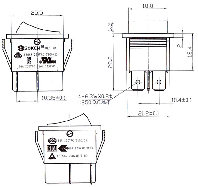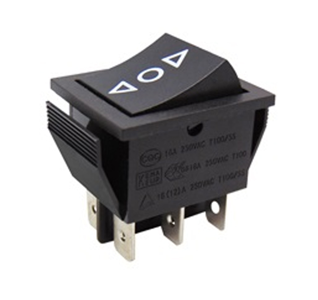 SOKEN RK1-01 2X3 B/B Διακόπτης Rocker Μεγάλος ON-OFF-ON με 6 επαφές. Μέγιστο ρεύμα 16Α / 250V.