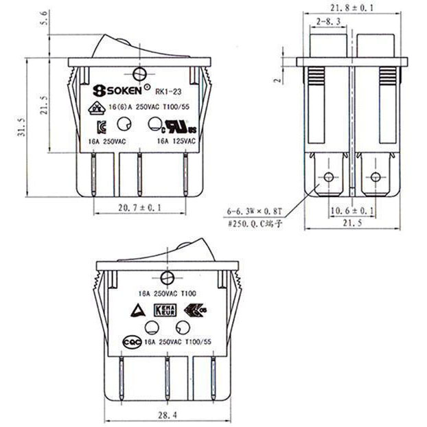 SOKEN RK1-23AB1X1X2N Διακόπτης Rocker Μεγάλος Διπλός ON-OFF 6P με λυχνία Κόκκινος 16A 220V
