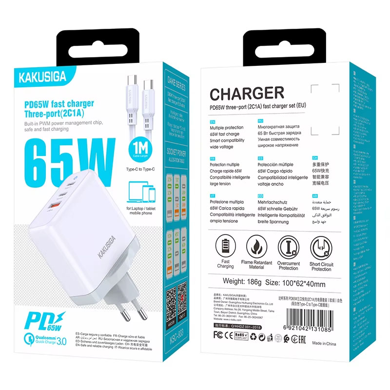 Ο φορτιστής πρίζας της εταιρείας KAKUSIGA, KSC-933 διαθέτει 3 θύρες USB-A και 2x USB-C συνολικής ισχύος 65W εκ των οποίων η μια είναι γρήγορης φόρτισης και μπορεί να αντικαταστήσει αυτόν που είχατε ή να βελτιώσει τη φόρτιση του κινητού σας. Η συσκευασία περιέχει καλώδιο USB-C-C