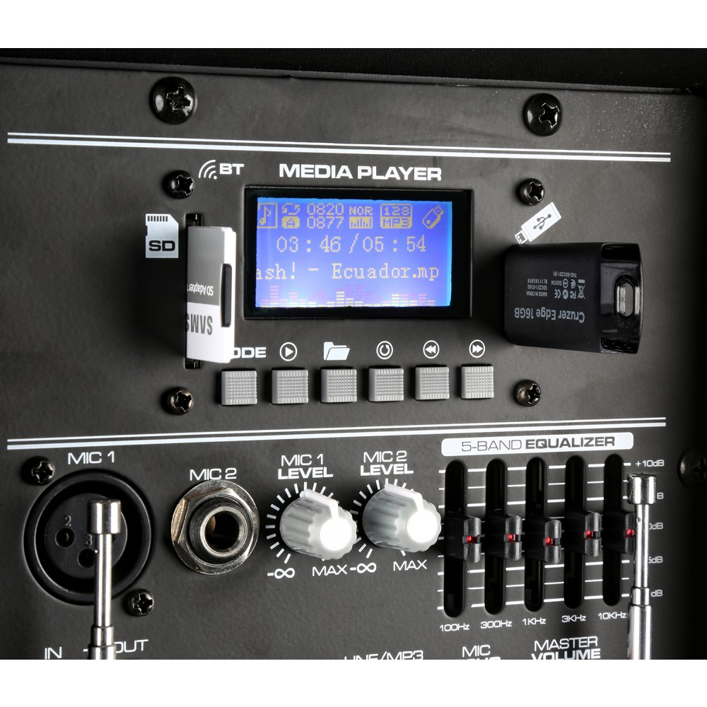 Μπορείτε να συνδέσετε επιπλέον 2 ενσύρματα μικρόφωνα ή κάποια εξωτερική πηγή με σύνδεση 2 x RCA. Τα μικρόφωνα διαθέτουν ανεξάρτητα ρυθμιστικά Volume και διαθέτει και ρυθμιστικό Echo, όπως και Master Volume. Επίσης η εξωτερική πηγή ή η αναπαραγωγή των MP3 διαθέτει δικό τους Volume control. Επιπλέον διαθέτει Line Out μέσω 2xRCA.