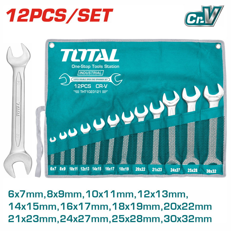 Σετ Γερμανικά κλειδιά 12τμχ. της TOTAL, THT1023121. Μεγάλης αντοχής, κατασκευασμένα από υψηλής ποιότητας κράμα CR-V (chromium vanadium). Το σετ περιλαμβάνει 6x7mm - 8x9mm - 10x11mm - 12x13mm - 14x15mm - 16x17mm - 18x19mm - 20x22mm - 21x23mm - 24x27mm - 25x28mm - 30x32mm.