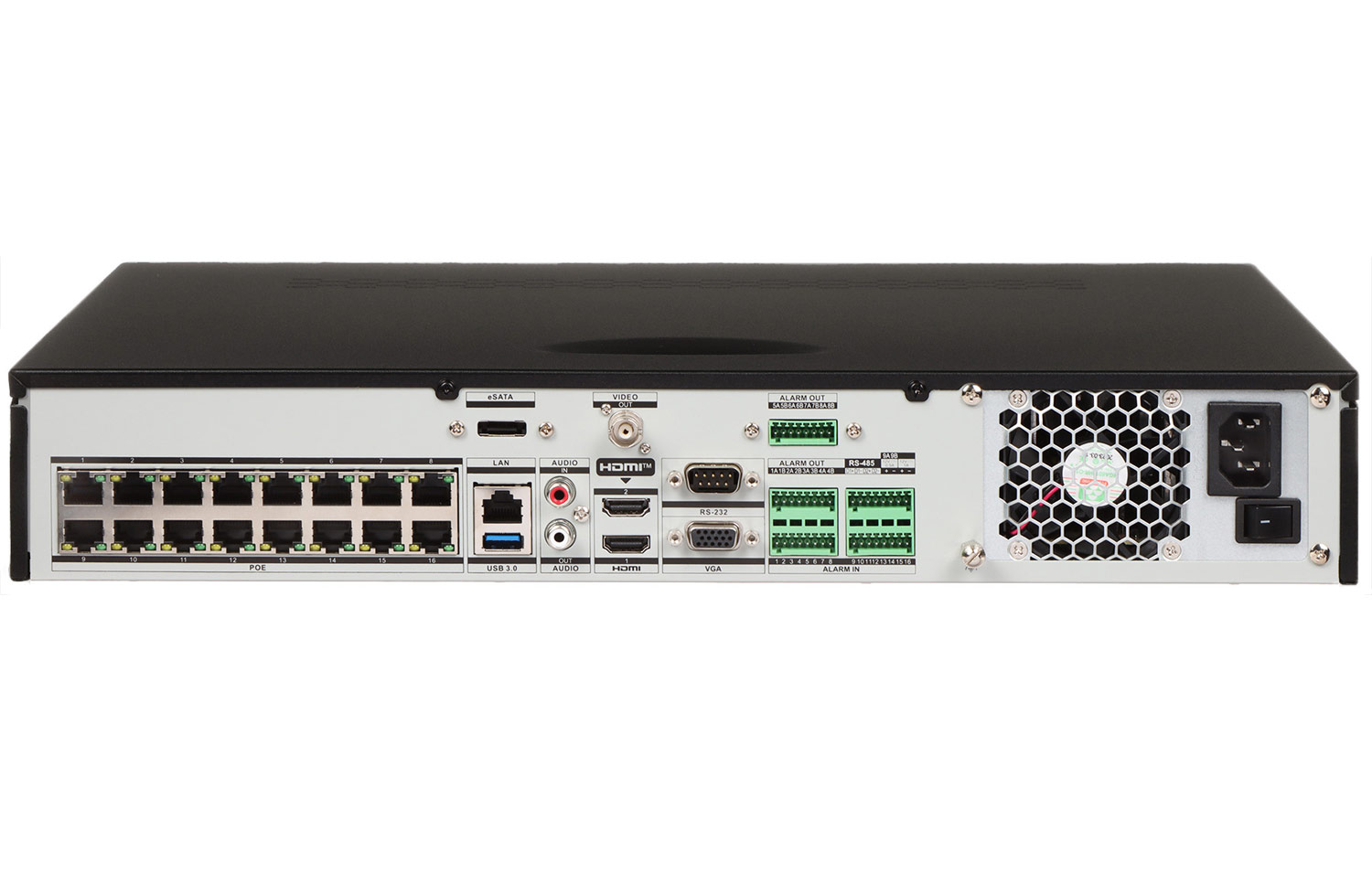 Επίσης, σημειώστε πως μπορεί να δεχθεί μέχρι 4 σκληρούς δίσκους 4xSATA HDD (max 10TB έκαστος - οι σκληροί δίσκοι δεν περιλαμβάνονται) και επίσης διαθέτει 1x eSata Interface. Επιπλέον, διαθέτει ένα κανάλι αναλογικού ήχου ήχου (RCA In / RCA Out) καθώς και 16 κανάλια Alarm In / 9 κανάλια Alarm Out. Στην πίσω όψη του θα βρείτε επίσης θύρα RS232 καθώς και θύρα RS485.
