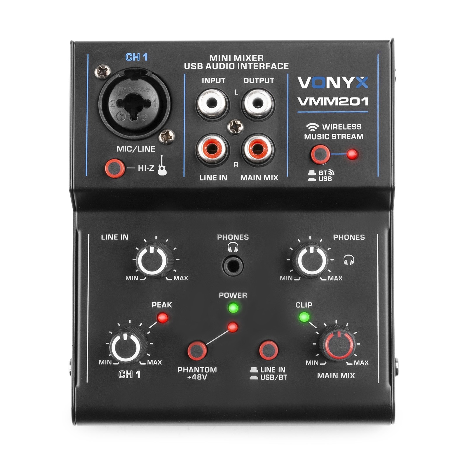 Μικρό και Compact mixer 2 καναλιών, κατάλληλο για podcast recording, home studios, εγγραφή φωνητικών, οργάνων, κλπ. Διαθέτει δέκτη Bluetooth και USB audio interface για σύνδεση απ'ευθείας με ηλεκτρονικό υπολογιστή και να λειτουργήσει ως κάρτα ήχου για αυτόν. Διαθέτει όλα τα βασικά ρυθμιστικά, όπως και τροφοδοσία Phantom power 48V για χρήση με πυκνωτικά Studio μικρόφωνα. Με το μίκτη VMM201 της Vonyx δημιουργήστε ένα πλήρες προσωπικό studio στο χώρος σας !