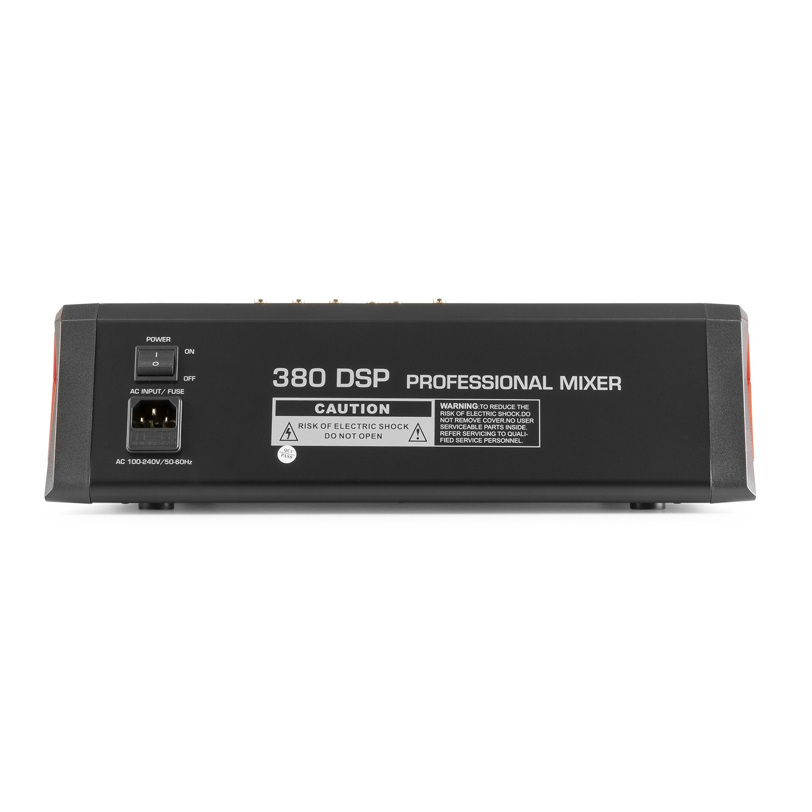 Stage Κονσόλα ήχου 6 καναλιών με 32-bit DSP effect processor 380 presets και 4x μνήμες, Stereo 7-band equalizer, Bluetooth ασύρματη σύνδεση, USB σύνδεση για αναπαραγωγή MP3 τραγουδιών ή εγγραφή (recording) ή σύνδεση με υπολογιστή. Κάθε κανάλι διαθέτει δικό του gain control, treble, mid και bass control. Δυνατότητα χρήσης μικροφώνων phantom 48V power.