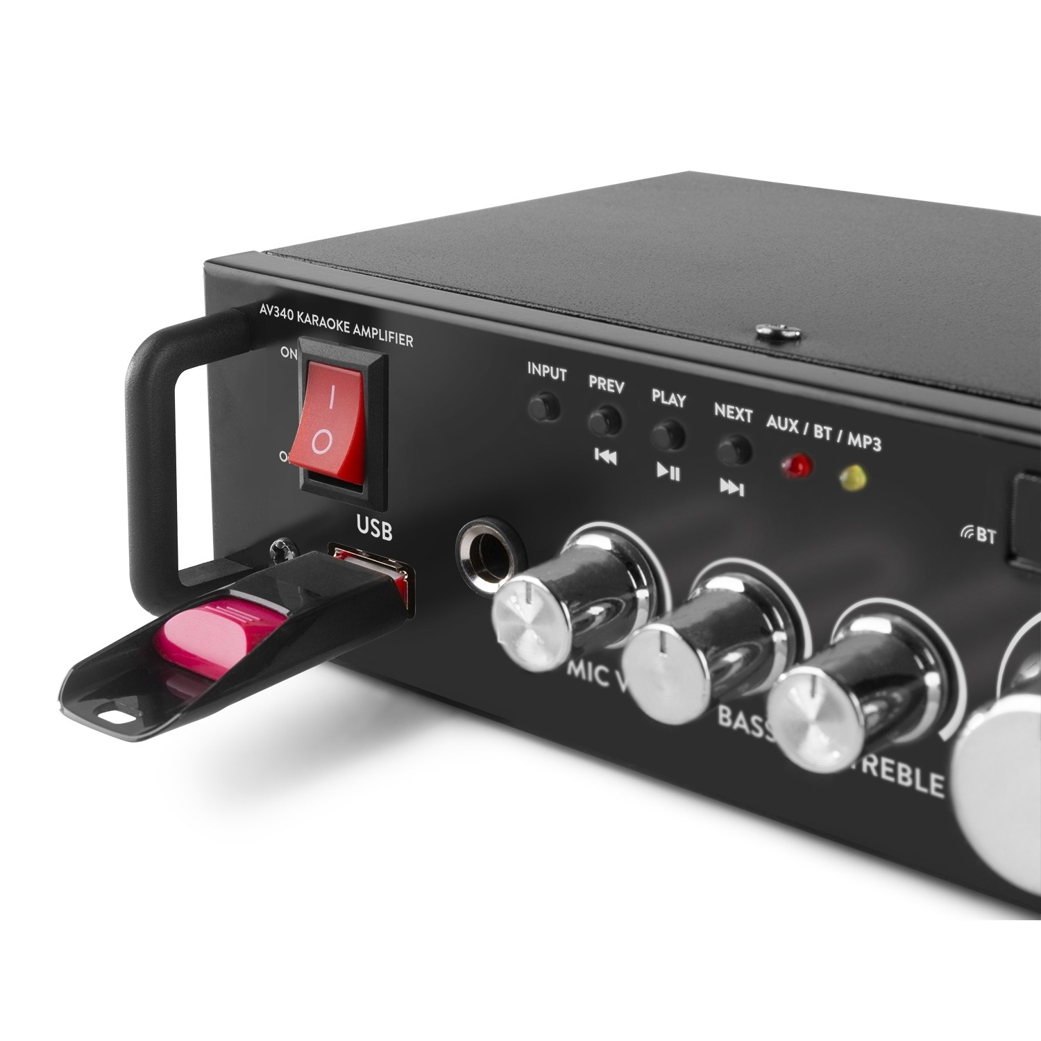 Compact - Mini Hi-Fi Karaoke ενισχυτής με ενσωματωμένο δέκτη Bluetooth και MP3 player μέσω USB. Επιπλέον διαθέτει είσοδο μικροφώνου 6.3mm για να τραγουδάτε πάνω στο αγαπημένο σας κομμάτι. Ένας πολύ μικρός ενισχυτής με πολλές δυνατότητες ! Η ισχύς του ενισχυτή είναι 2 x 50 Watt Max και μπορείτε επιπλέον να συνδέσετε και 1 εξωτερική πηγή (CD, PC, AUX, κλπ).