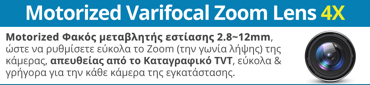 Διαθέτει φακό Motorized Zoom Lens 4X μεταβλητής εστίασης 2.8~12mm με μοτέρ, ο οποίος σας επιτρέπει την ρύθμιση του Zoom και του Focus της κάμερας απομακρυσμένα, απευθείας από το TVT καταγραφικό της εγκατάστασης σας.