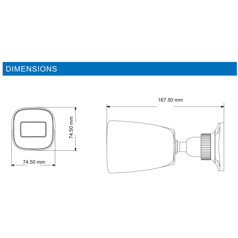 Διαθέτει σταθερό ευρυγώνιο φακό 2.8mm και μεταλλικό αδιάβροχο κέλυφος με βαθμό στεγανότητας IP67 ώστε να είναι πλήρως κατάλληλη για χρήση σε εξωτερικούς χώρους. Για την λήψη εικόνας κατά τις νυχτερινές ώρες, η κάμερα διαθέτει τον απαραίτητο υπέρυθρο φωτισμό IR, ώστε να ανταποκρίνεται πλήρως σε ανάγκες ημερήσιας αλλά και νυχτερινής παρακολούθησης, με ικανοποιητική δράση των υπέρυθρων LED σε αποστάσεις της τάξεως των 20~30 μέτρων.