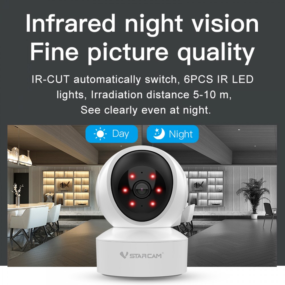 Η CS49Q της Vstarcam προορίζεται για χρήση αποκλειστικά σε εσωτερικούς χώρους, για ημερήσια και νυχτερινή παρακολούθηση, αφού με 6 υπέρυθρα LED τεχνολογίας SMD που διαθέτει, μπορεί να καλύψει νυχτερινή παρακολούθηση σε αποστάσεις μέχρι 5~10 μέτρα.