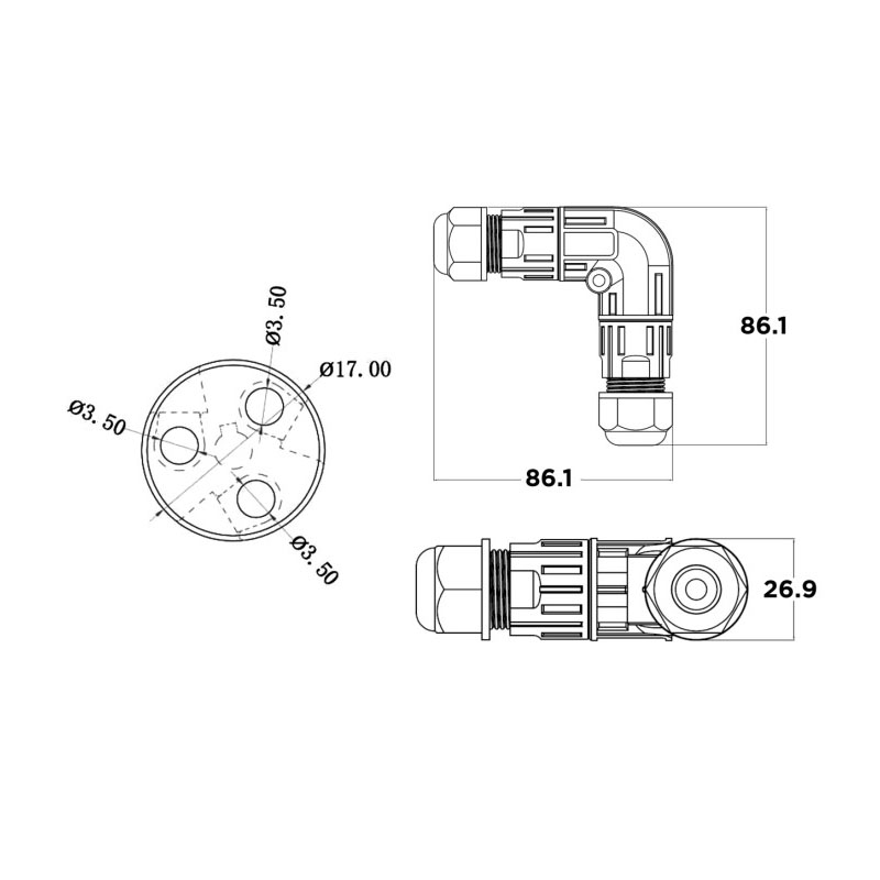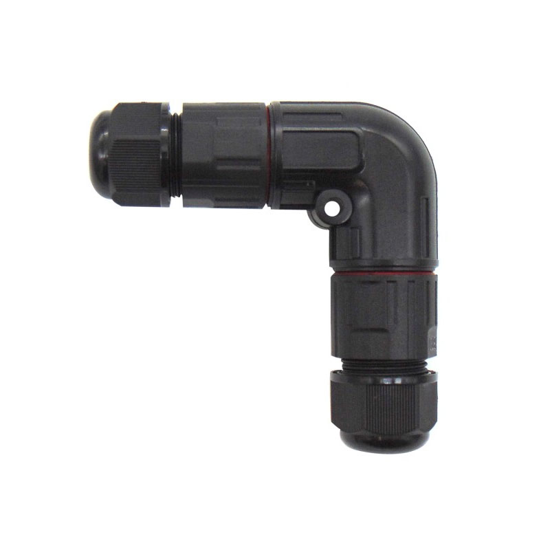 Αδιάβροχος σύνδεσμος καλωδίων M16A L-TYPE BLK 3P 1.5mm² με βιδωτή κλέμμα και λάστιχο διεύλεσης για εξωτερικούς χώρους, ιδανικός για τροφοδοσία και μεταφορά σημάτων.