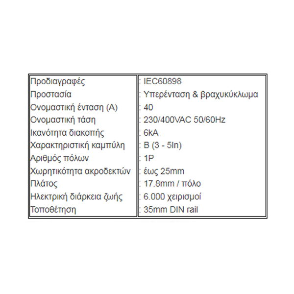 Ασφάλεια Ράγας 1P B 40A 6kA 230/400VAC της LS, BKN B40A. Εξασφαλίζει προστασία από βραχυκύκλωμα και υπερφόρτωση. Η LS Industrial Systems αποτελεί θυγατρική της LG, και ως ηγέτης στο τομέα εξοπλισμού αυτοματοποίησης στη Κορέα κατασκευάζει και προμηθεύει τελευταίας τεχνολογίας συστήματα υψηλής ποιότητας σύμφωνα με διεθνής προδιαγραφές.
