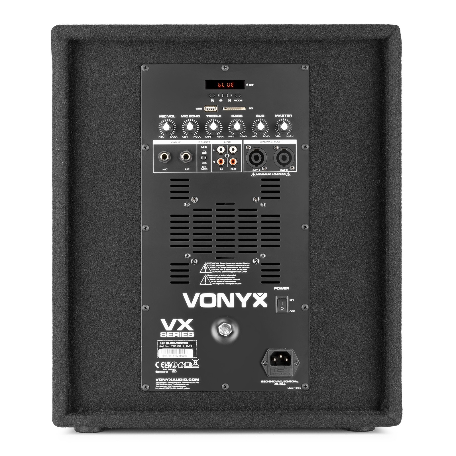 VONYX VX1000BT 2.2 Αυτοενισχυόμενο Σετ Ηχείων με 2x Top Speaker και 2x Subwoofer 10" 170.104. Το σετ της Vonyx είναι πλήρες μιας και περιλαμβάνει 2 βάσεις στήριξης των Top Speaker πάνω στα Subwoofers, καλώδια σύνδεσης των ηχείων, ενσύρματο μικρόφωνο και ασύρματο τηλεχειριστήριο. Σε όλα αυτά προστίθενται και οι λειτουργίες αναπαραγωγής MP3 τραγουδιών μέσω USB και κάρτας SD, όπως και ο δέκτης Bluetooth για streaming μουσικής ασύρματα από το Smartphone, Tablet, Laptop, κλπ.