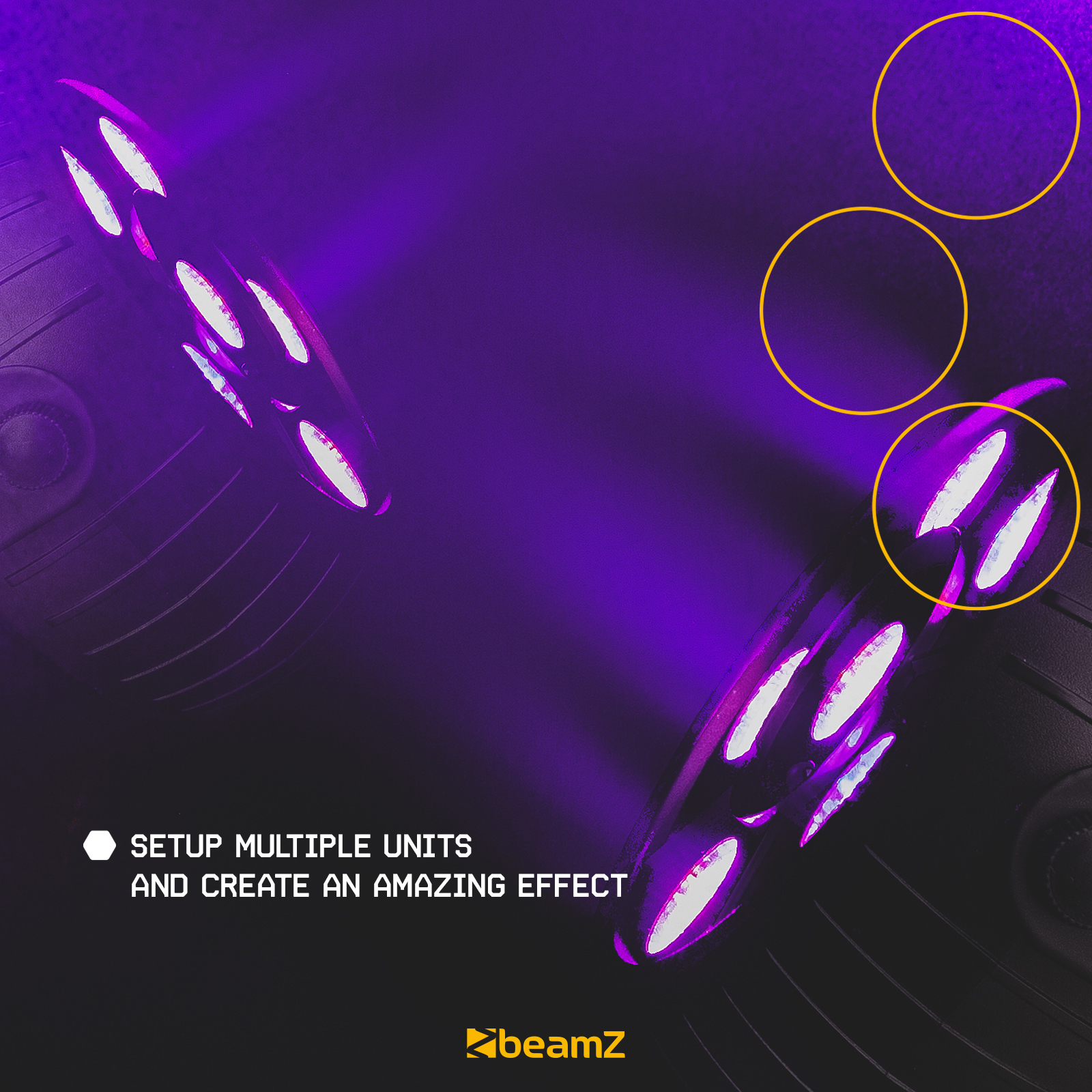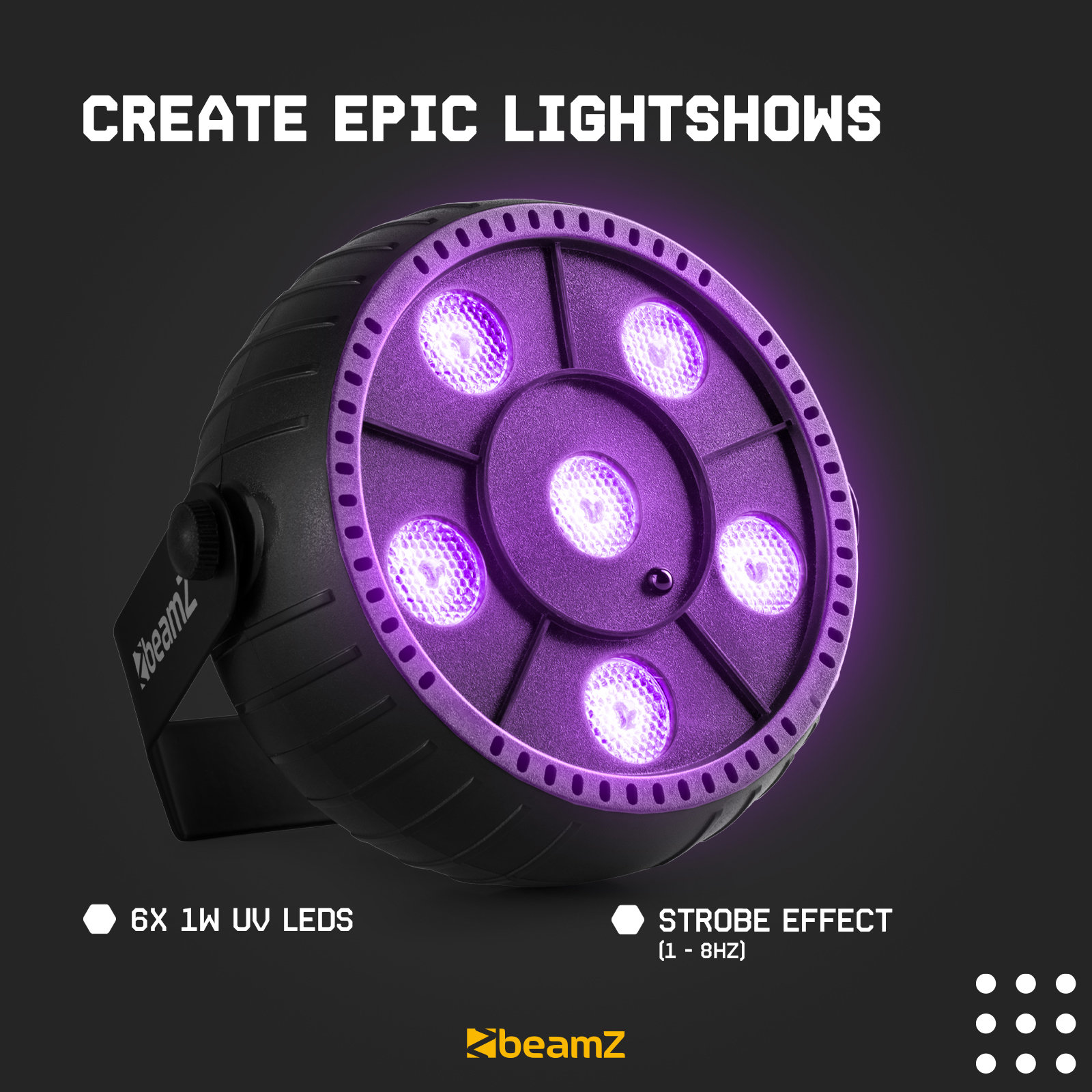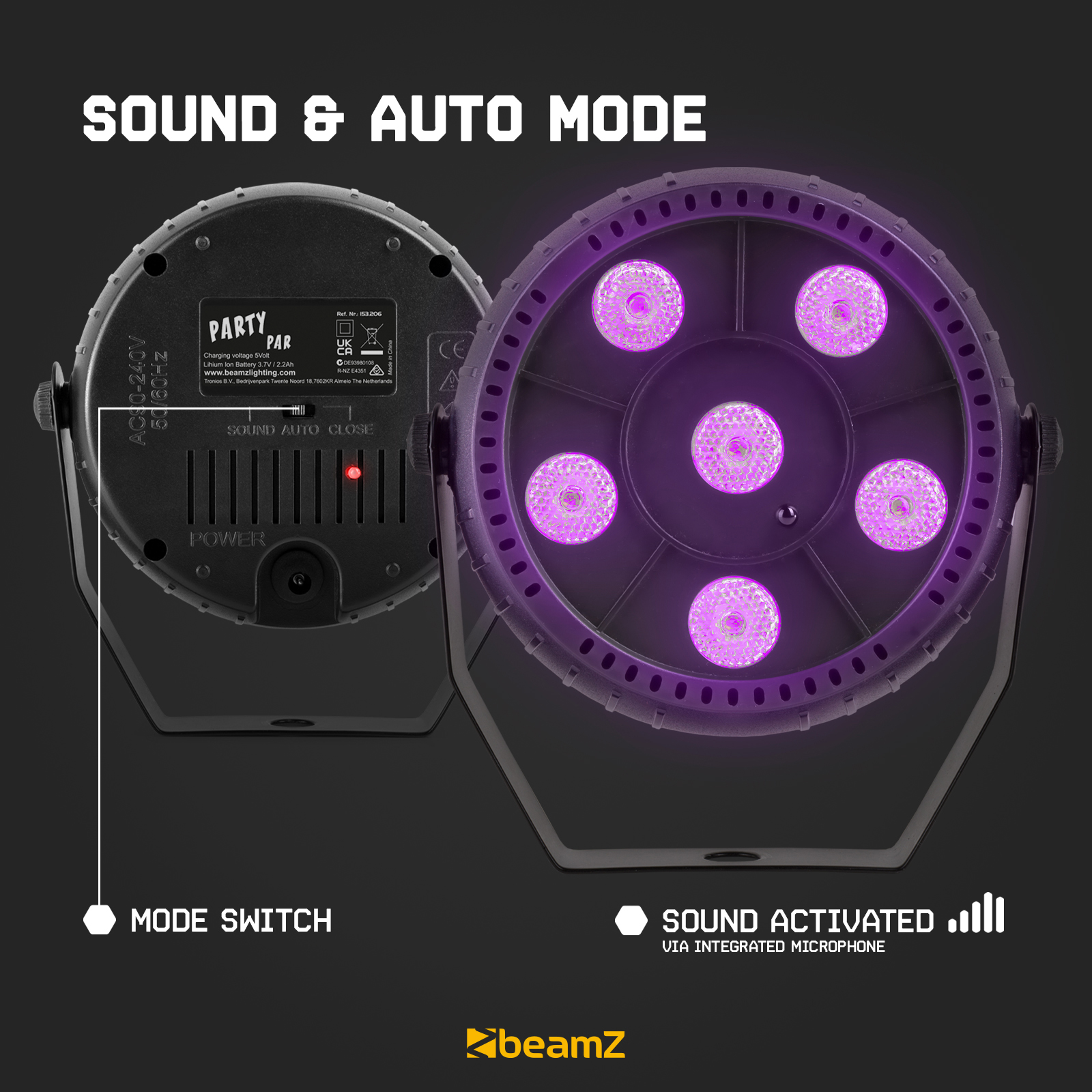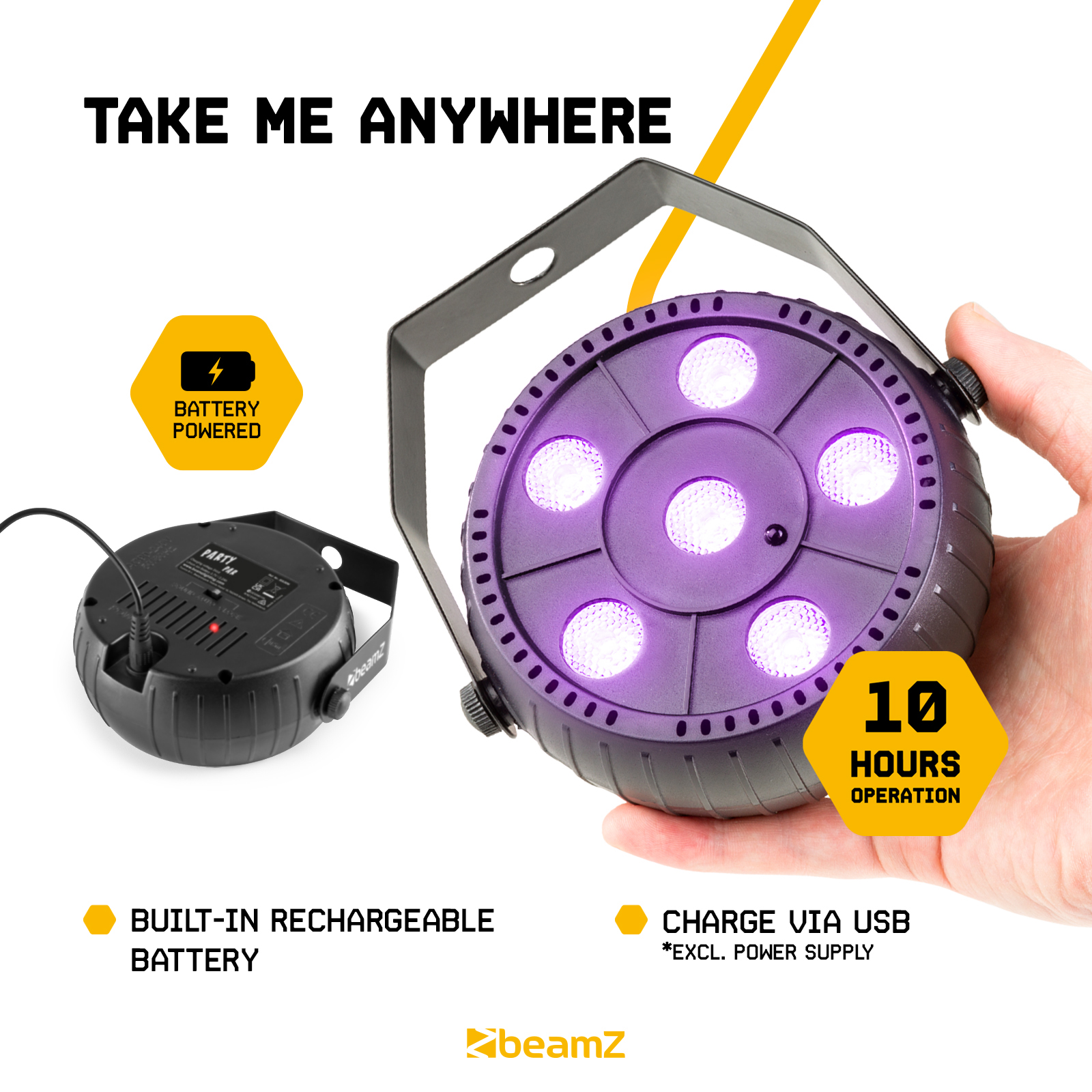 Φορητό και Compact LED PAR με 6x UV LEDs ισχύος 1 Watt το κάθε ένα. Ένα φωτιστικό με απίθανη φωτεινότητα σε ανίκητη τιμή ! Ένα φωτιστικό που λειτουργεί με επαναφορτιζόμενη μπαταρία ώστε να το έχετε παντού και πάντα μαζί σας. Στήστε το φωτισμό για το υπαίθριο πάρτι στη στιγμή ! Εύκολη φόρτιση μέσω καλωδίου USB το οποίο παρέχεται στη συσκεασία και εύχρηστος χειρισμός από το ασύρματο χειριστήριο που διαθέτει. Με πλήρη φόρτιστη μπορεί να φτάσει και τις 10 ώρες λειτουργίας !
