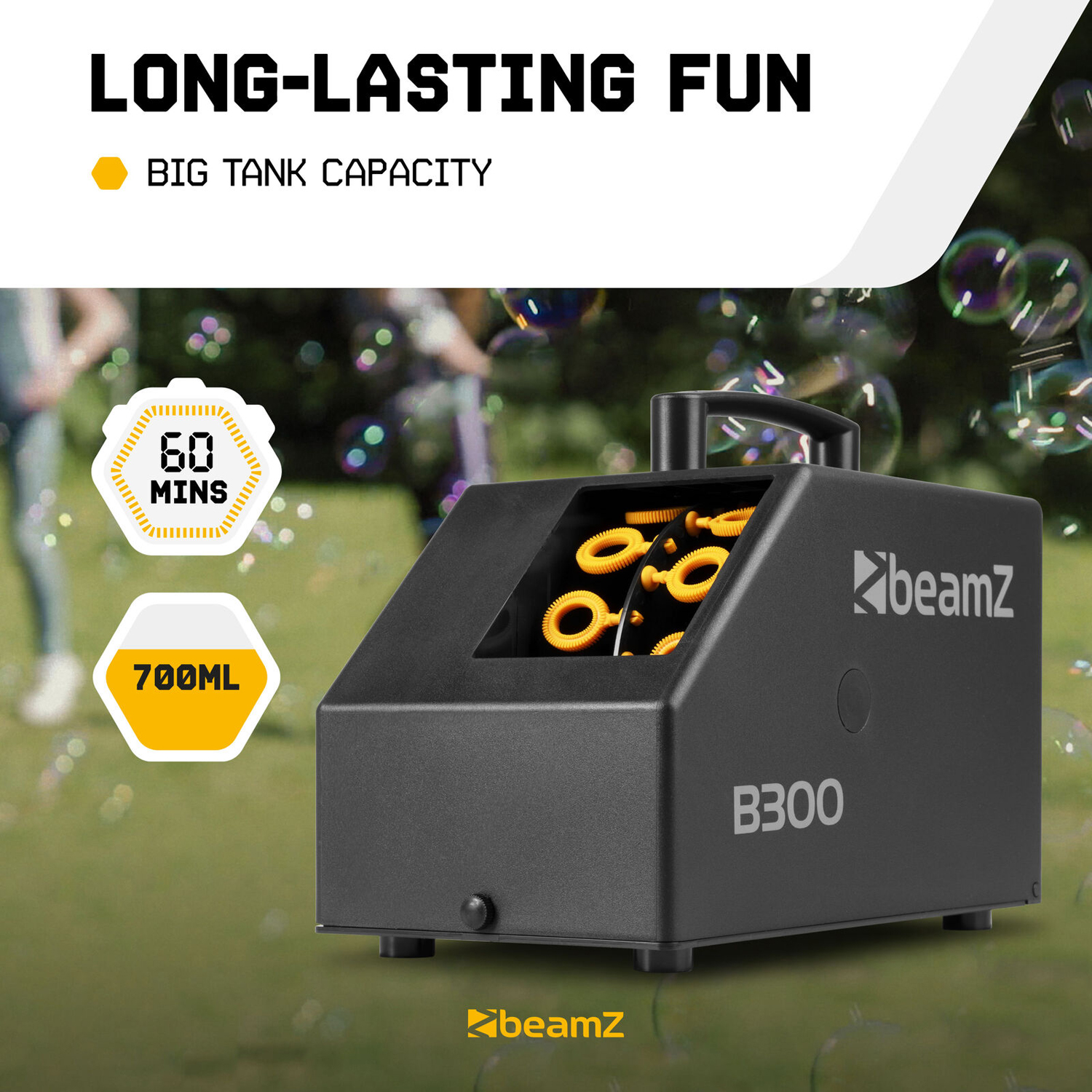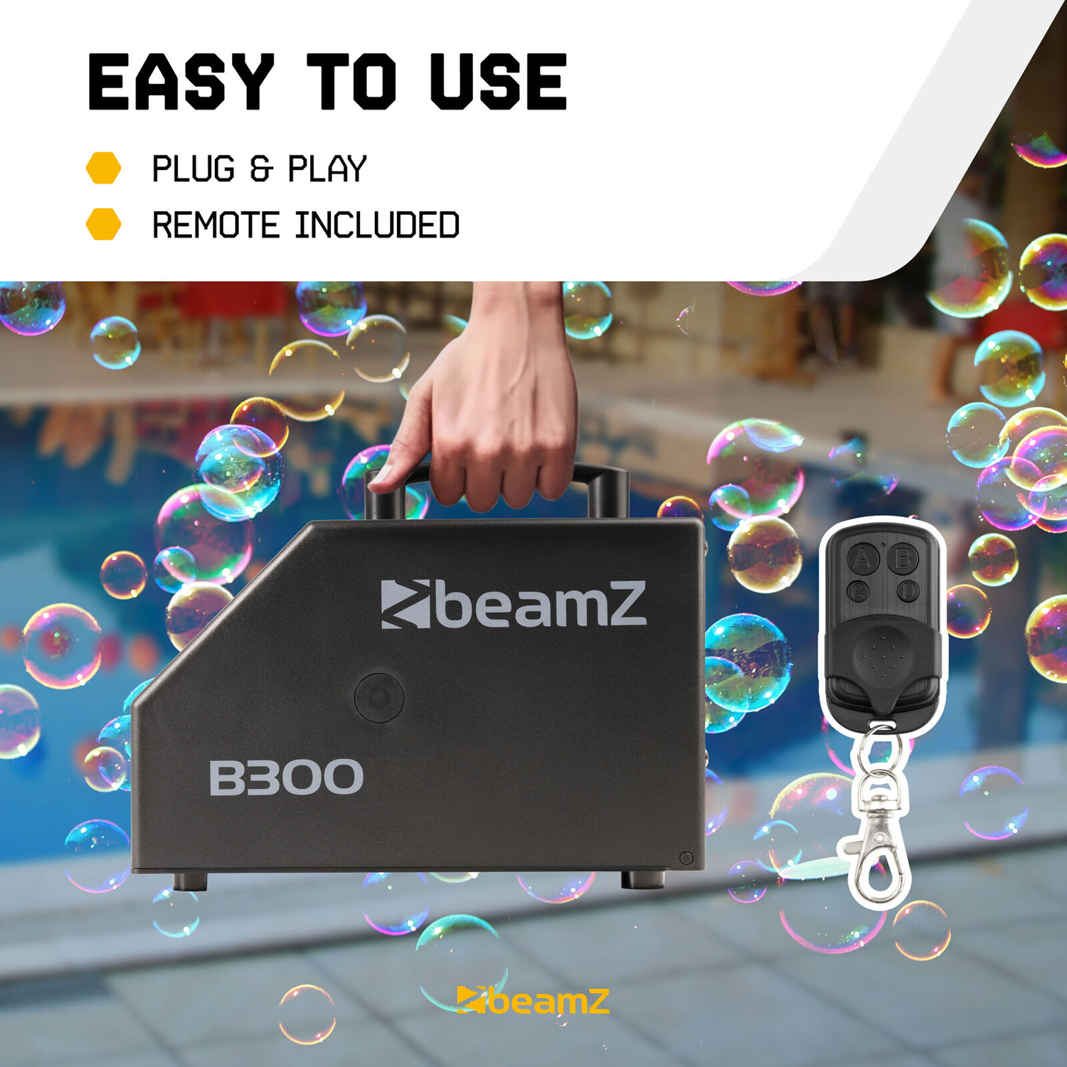 Το BeamZ B300 υπερέχει στην ευκολία χρήσης. Η συσκευή είναι plug-and-play. Αυτό σημαίνει ότι μπορείτε να τη χρησιμοποιήσετε αμέσως μόλις την παραλάβετε. Απλώς ττην βάζετε στην πρίζα, γεμίζετε τη δεξαμενή με υγρό φυσαλίδων (προσέξτε ότι πωλείται χωριστά) και με ένα πάτημα ενός κουμπιού από το ασύρματο χειριστήριο οι φυσαλίδες αρχίζουν να χορεύουν στον αέρα. Με χωρητικότητα 700ml υγρού, η B300 εγγυάται ότι το πάρτι σας θα γεμίσει με αιωρούμενες φυσαλίδες για μεγάλο χρονικό διάστημα. Επιπλέον, χάρη στο μικρό της βάρος (μόλις 1,65 kg) και στην εύχρηστη λαβή, μπορείτε να την πάρετε μαζί σας όπου κι αν είναι το πάρτι !