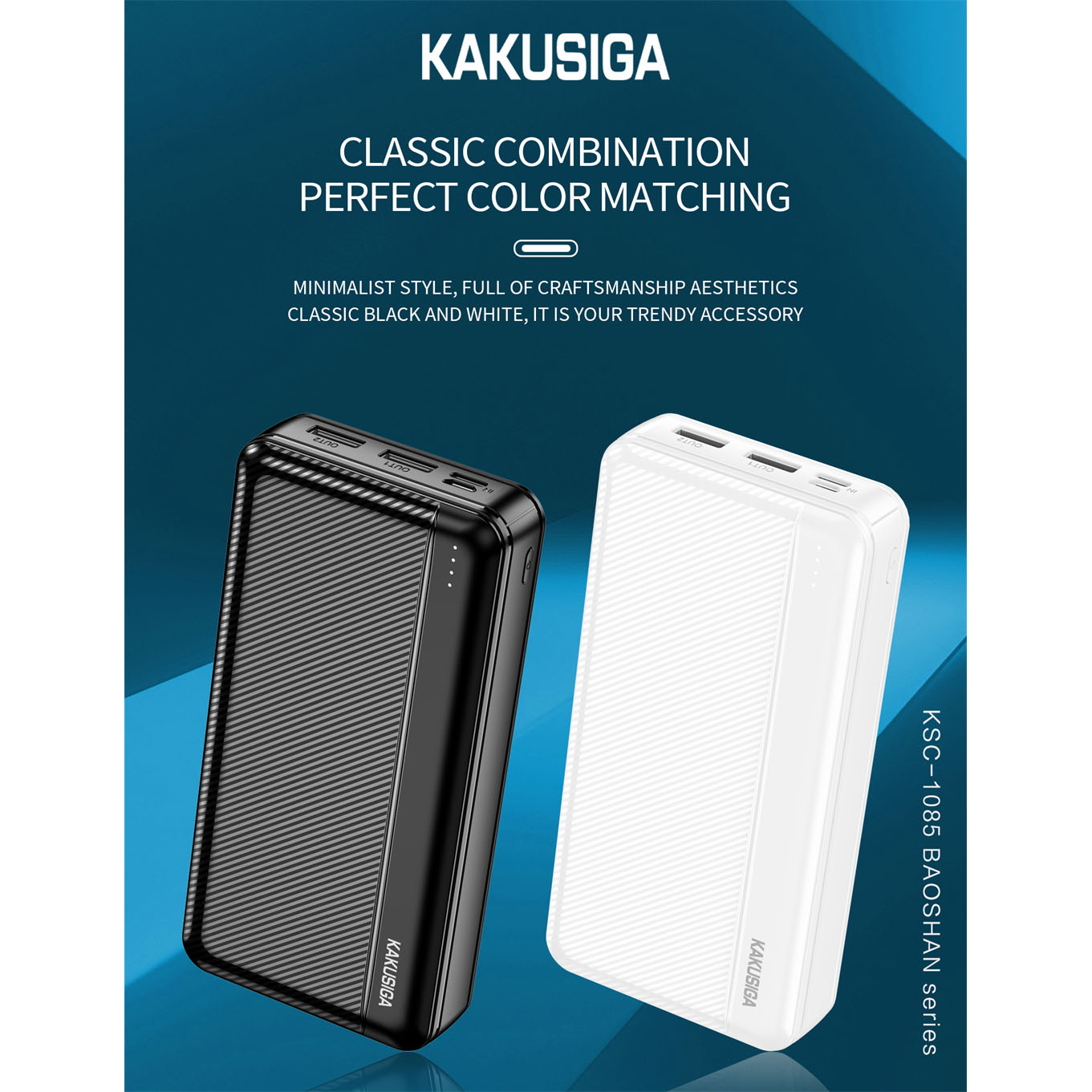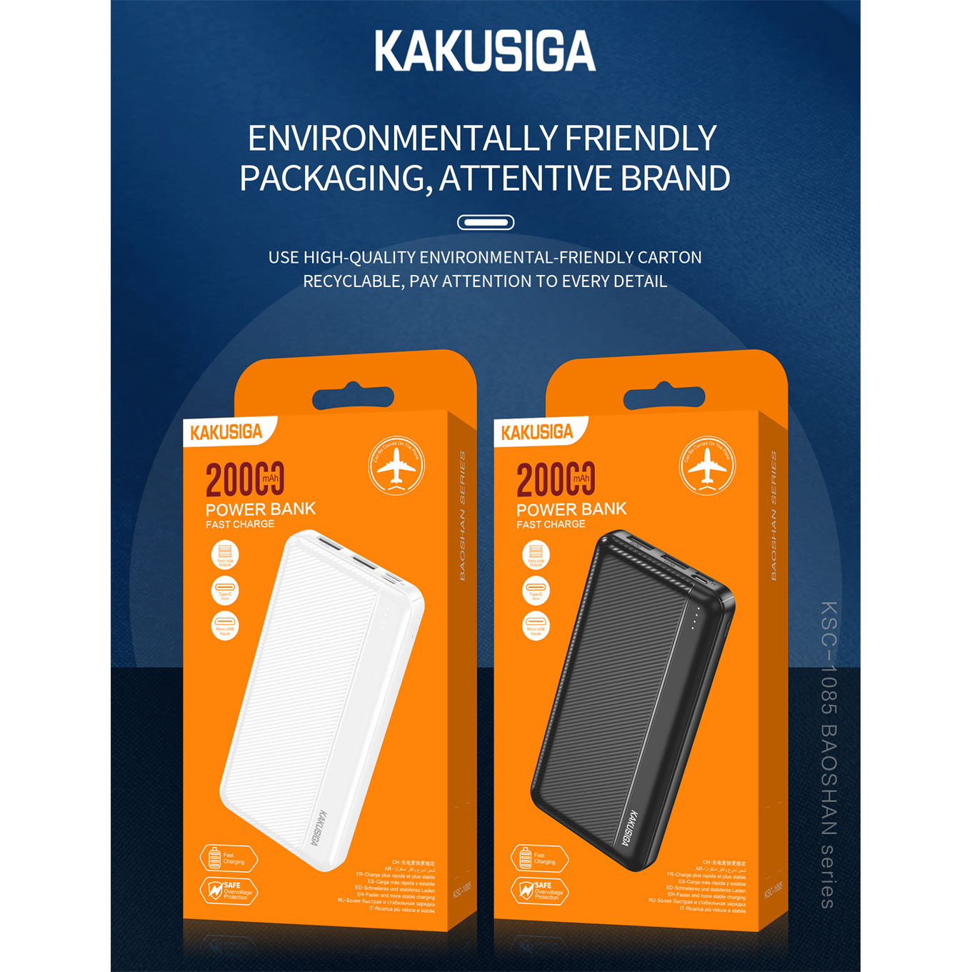 Power Bank 20000 mAh 2x USB-A της KAKUSIGA, KSC-1085. Για τροφοδοσία και ταχεία φόρτιση για τα περισσότερα iphones, tablet, smartphones, φωτογραφικές µηχανές, GPS, MP3 κ.ά.. Διαθέτει 2x θύρες φόρτισης USB-A για φόρτιση συσκευών. Ακόμη διαθέτει microUSB / Type-C για την φόρτιση του powerbank.