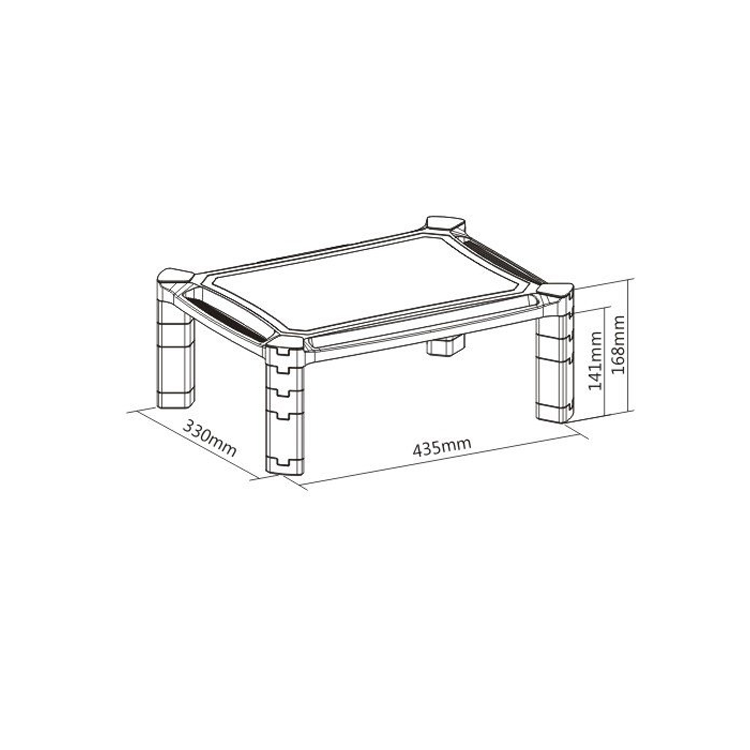 Το ύψος ρυθμίζεται αφαιρώντας τα 3x αποσπώμενα κομμάτια που αποτελούν τo κάθε πόδι της βάσης.Διαθέτει επίσης στη μπροστινή όψη smartphone holder για τοποθέτηση κινητού ή tablet και εύκολη πρόσβαση σε αυτό, πλαινές θέσεις για μικρά αντικείμενα όπως στυλό και εγκοπές για οργάνωση καλωδίων στην οπίσθια πλευρά.