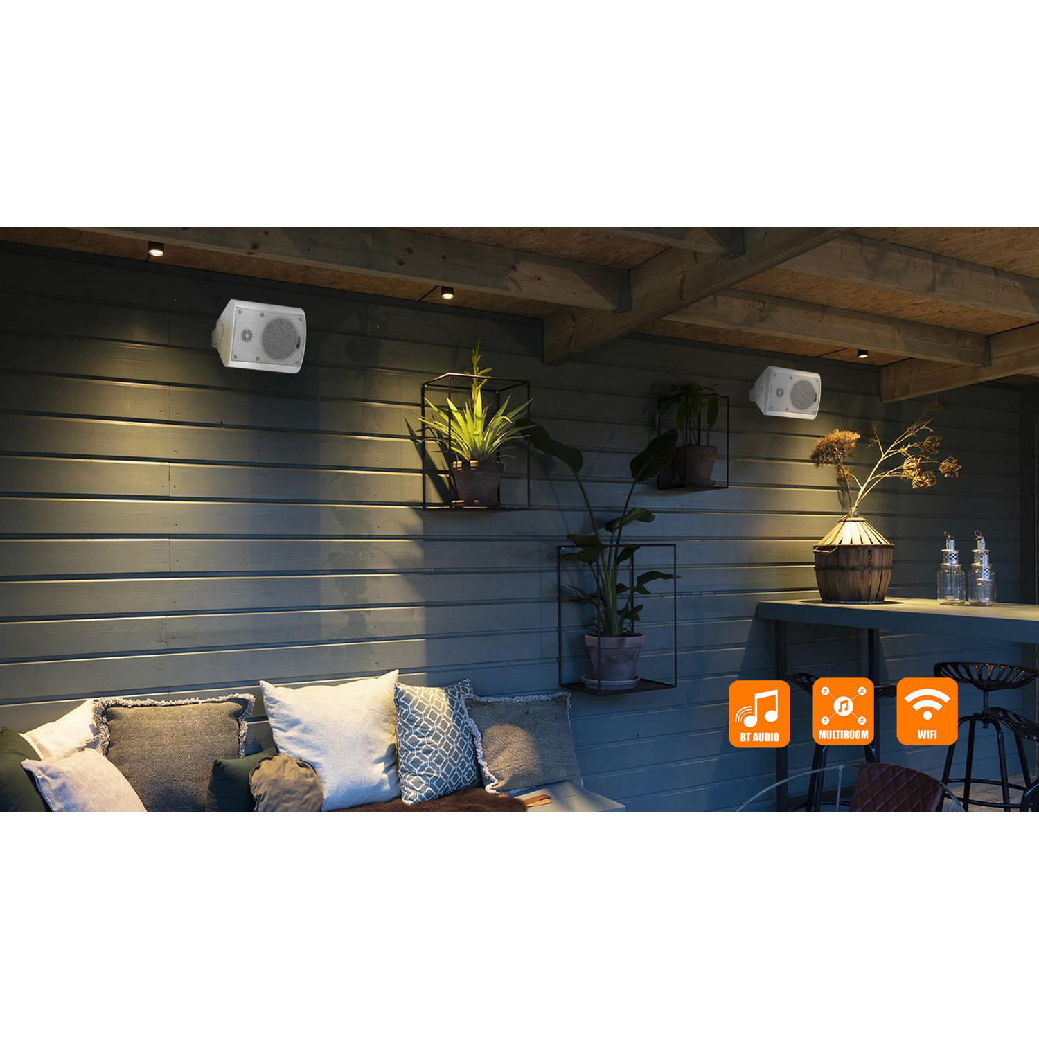 Ζεύγος ηχείων εγκατάστασης με σύνδεση WiFi και Bluetooth και ασύρματο χειριστήριο. Ηχεία σχεδίασης 2 δρόμων με woofer 4" και tweeter 1/2" Mylar dome ισχύος 100 Watt Max / 25 Watt RMS. Υψηλής ποιότητας ηχεία σε λευκό χρώμα για εσωτερική και εξωτερική χρήση (IP55) που συνοδεύονται και με βάσεις στήριξης.