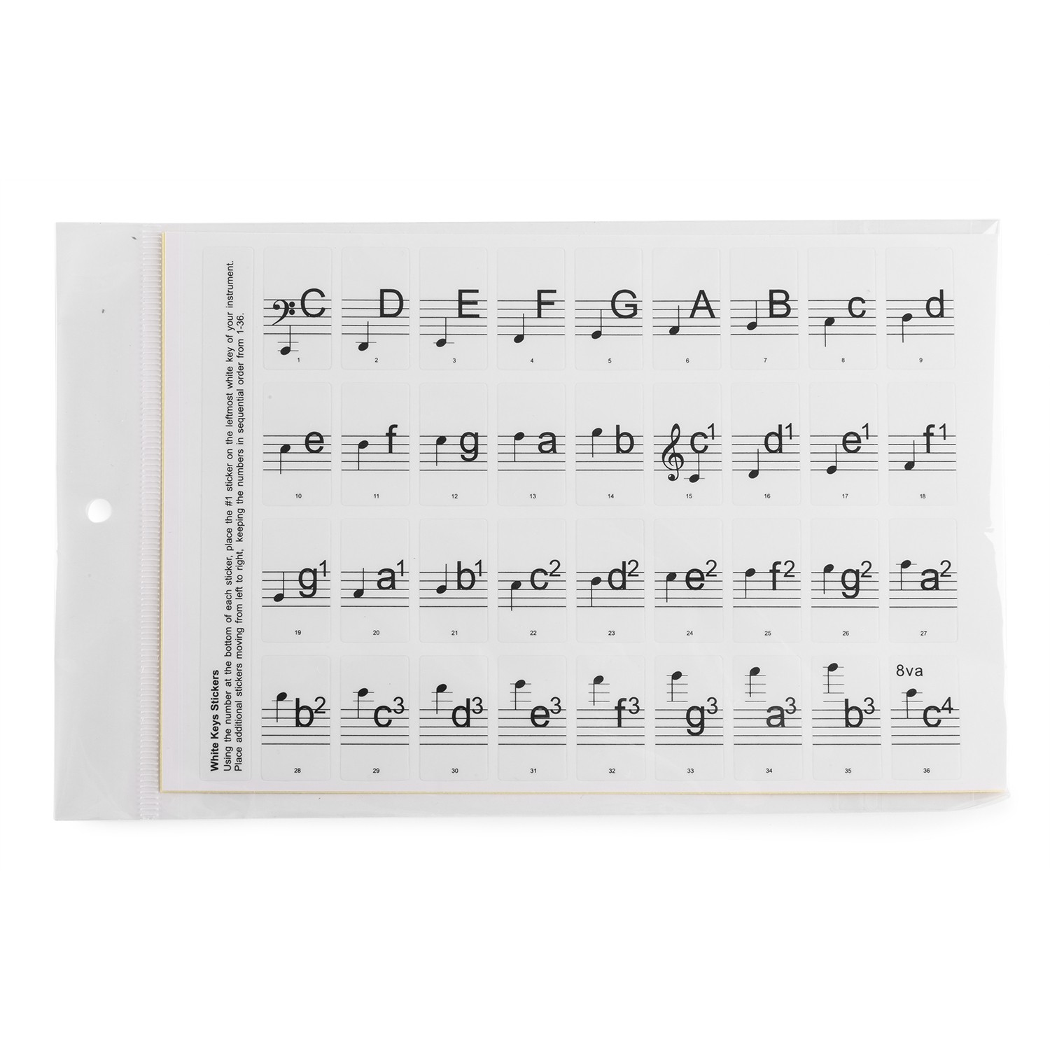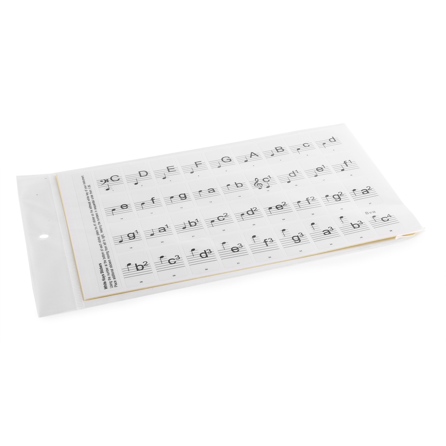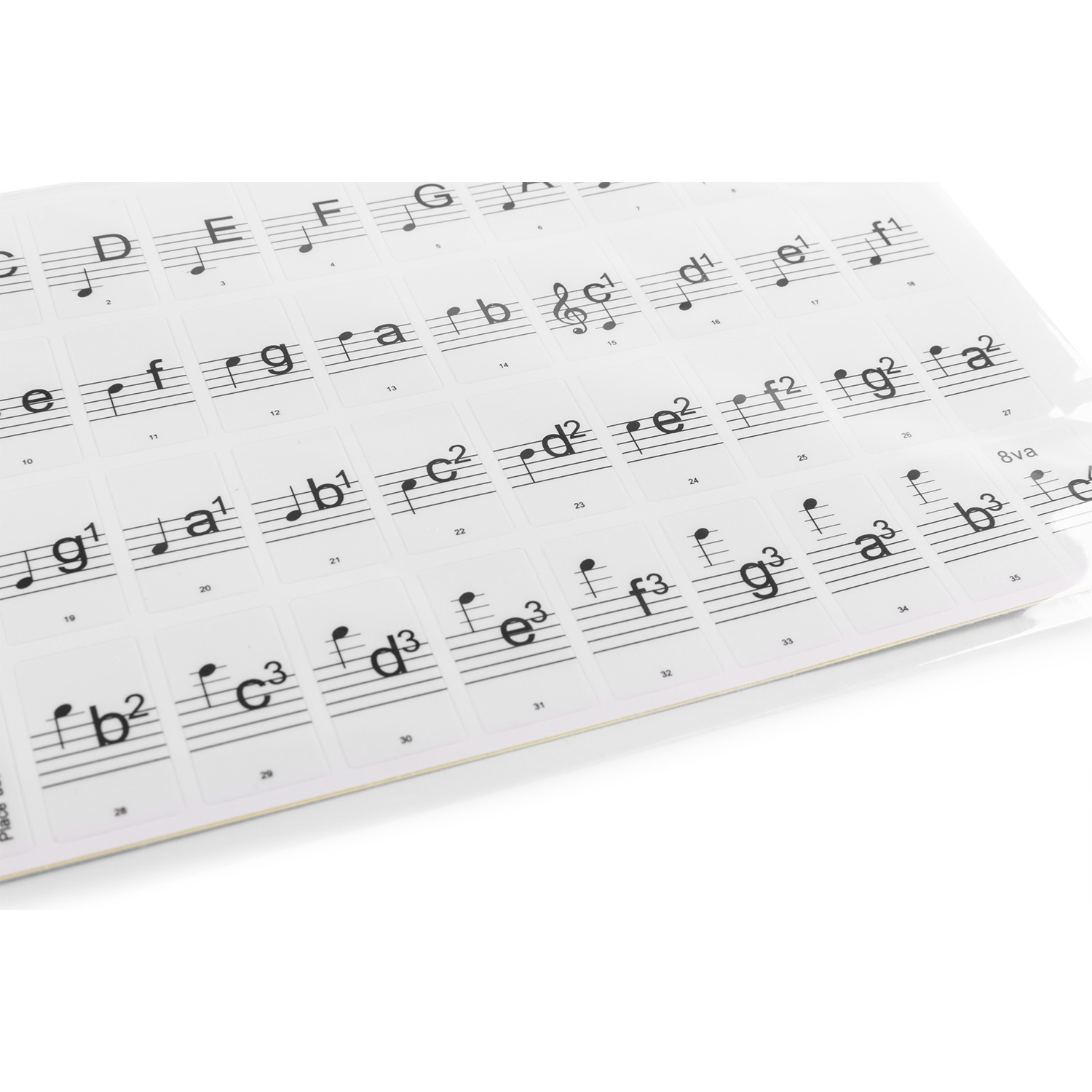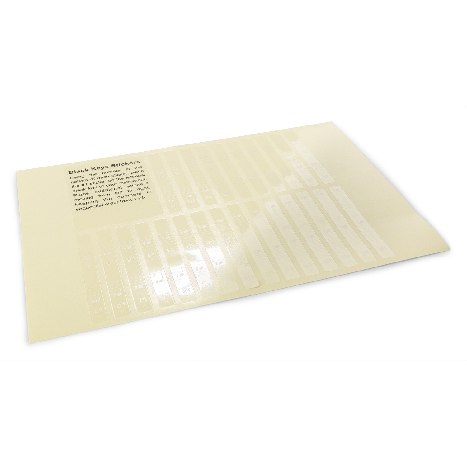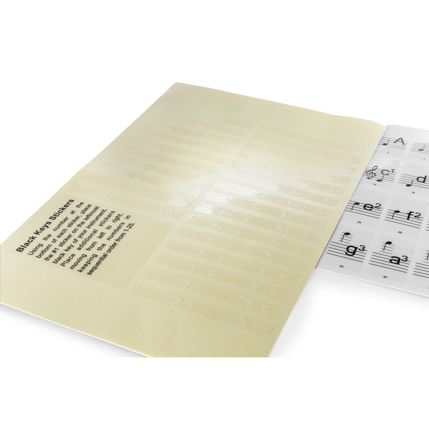 Περιλαμβάνοται 36 αυτοκόλλητα για τις φυσικές νότες (λευκά πλήκτρα) και 25 αυτοκόλλητα για τις αλλοιώσεις (μαύρα πλήκτρα). Μπορούν να αφαιρεθούν εύκολα.