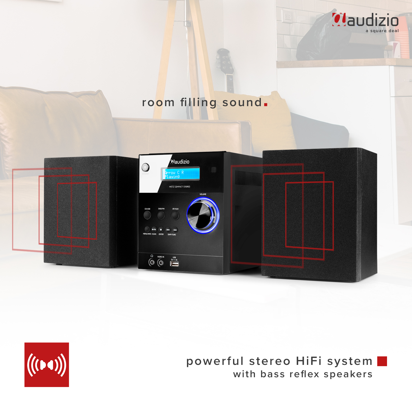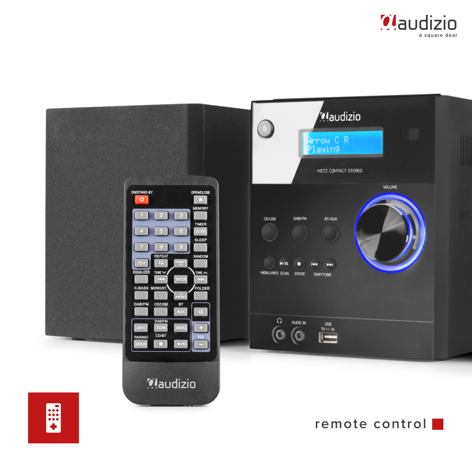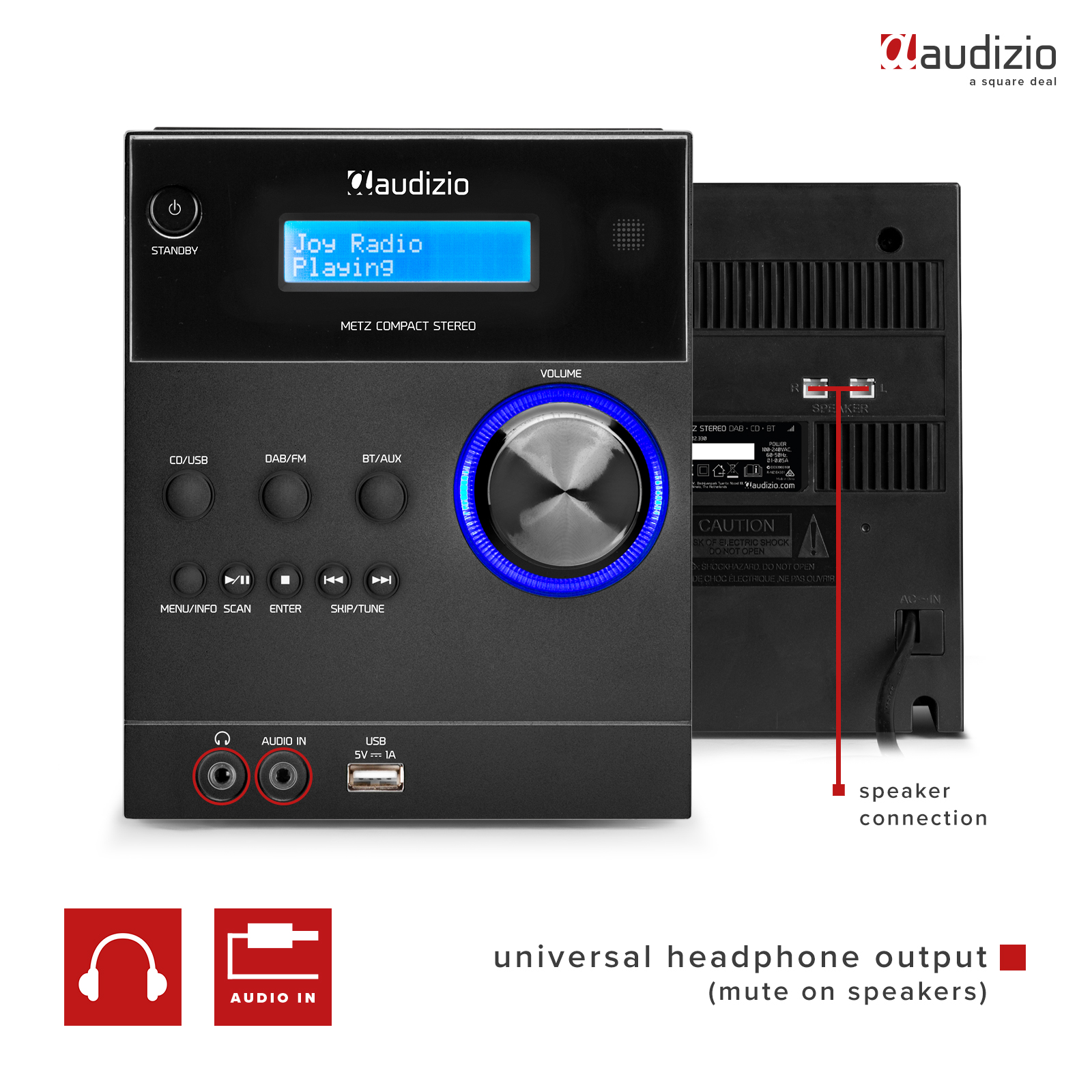 Micro HIFI Ραδιόφωνο DAB+, FM με AUX IN - USB - Bluetooth, CD player και Alarm. Απολαύστε την αγαπημένη σας μουσική στο σαλόνι σας, στην κουζίνα σας ακόμα και στο υπνοδωμάτιο σας χάρις το compact hifi της AUDIZIO METZ. Σας προσφέρει πολλές δυνατότητες συνδεσιμότητας σε μικρές διαστάσεις με 2 ηχεία καθιστώντας το  ελκυστική επιλογή! Μερικές από τις δυνατότητες του ηχοσυστήματος: