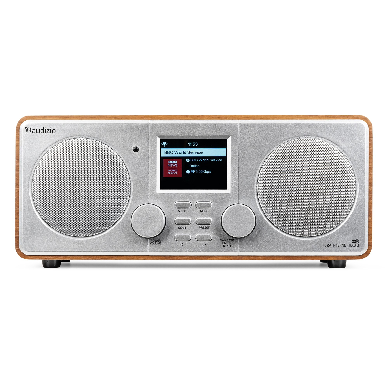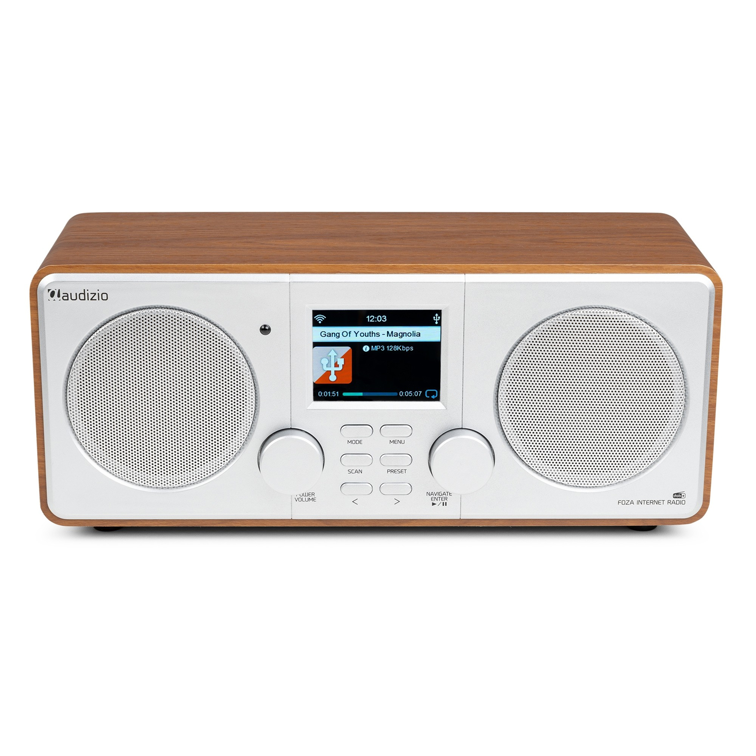 AUDIZIO FOZA WOOD Ραδιόφωνο Wi-Fi Internet STEREO DAB+ FM με Bluetooth και Ξυπνητήρι 102.302. All-in-One ραδιόφωνο της Audizio σε ξύλινο περίβλημα που εντυπωσιάζει με την πρώτη ματιά με τον κομψό, στιλάτο σχεδιασμό και τα μοντέρνα χαρακτηριστικά του. Η ενσωματωμένη μονάδα Wi-Fi επιτρέπει τη λήψη διαδικτυακών ραδιοφωνικών σταθμών, έχετε πρόσβαση σε περισσότερους από 32.000 διαδικτυακούς ραδιοφωνικούς σταθμούς από όλο τον κόσμο, συμπεριλαμβανομένων τοπικών ραδιοφωνικών σταθμών. Επιπλέον μπορεί να κάνει λήψη ραδιόφωνου DAB+, όπως και FM. Τα μοντέλα Foza διαθέτουν μια μεγάλη έγχρωμη οθόνη LCD 2.8" που εμφανίζει τον επιλεγμένο ραδιοφωνικό σταθμό, καθώς και το τρέχον πρόγραμμα και πληροφορίες για τον καιρό. (Εάν ενεργοποιηθεί από τον ραδιοτηλεοπτικό φορέα). Με την ασύρματη τεχνολογία BT, αναπαράγετε μουσική απευθείας από την δική σας συσκευή (smartphone, tablet, laptop, κλπ), απευθείας στο FOZA της Audizio