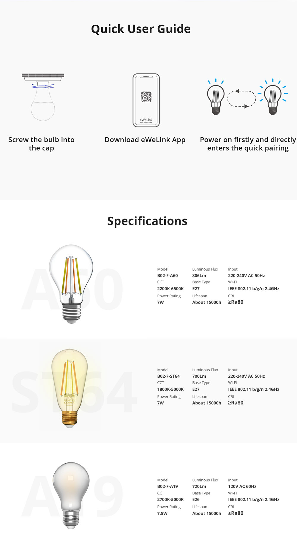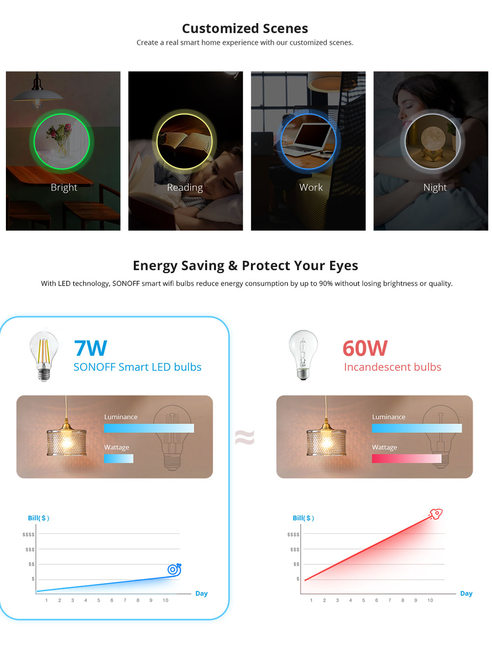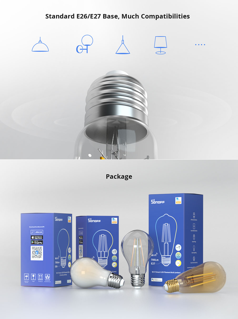 Sonoff B02-F-A60 έξυπνη λάμπα LED τύπου Filament, κατάλληλη για βιδωτό ντουί Ε27, φωτεινότητας 806Lm, με κατανάλωση 7W. Διαθέτει ενσωματωμένο WiFi module, για πλήρη χειρισμό και παραμετροποίηση, μέσω της εφαρμογής eWeLink απευθείας από το κινητό σας, όπως όλα τα WiFi προϊόντα της Sonoff.