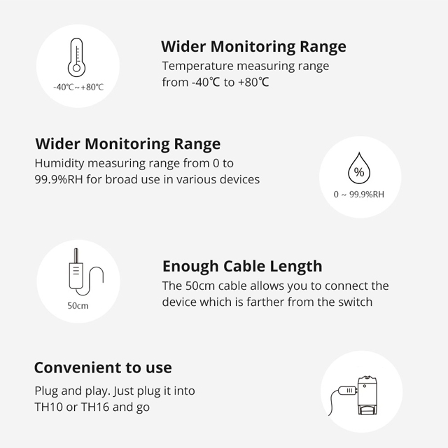 Είναι κατάλληλος για χρήση με τον έξυπνο διακόπτη & Ελεγκτή Θερμοκρασίας και Υγρασίας TH16 και TH10 της Sonoff. Το μήκος του καλωδίου του αισθητήρα είναι μισό μέτρο (50cm), αλλά μπορεί να επιμηκυνθεί με την χρήση του καλωδίου προέκτασης Sonoff AL560, μήκους 5 μέτρων (δείτε σχετικό προϊόν παρακάτω).