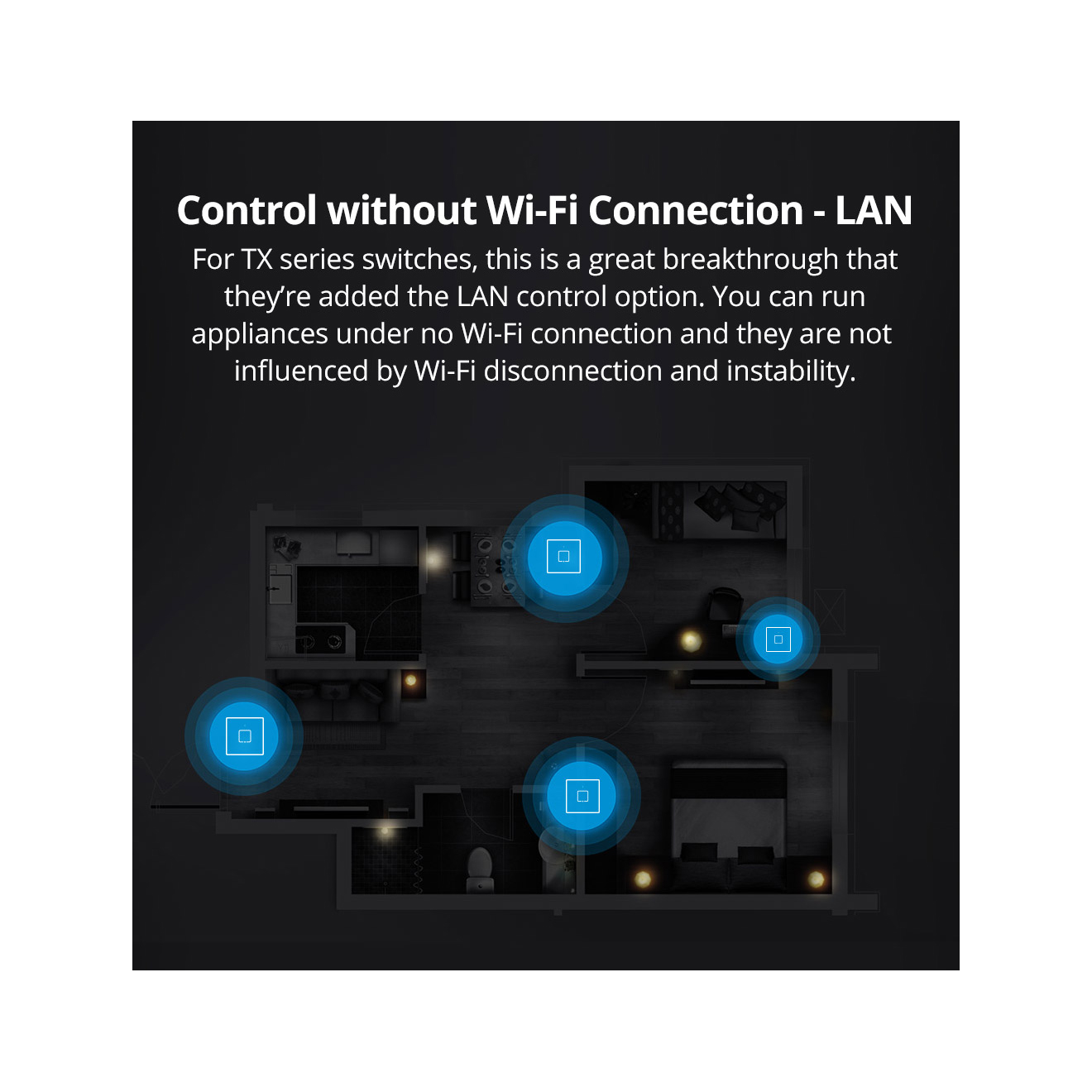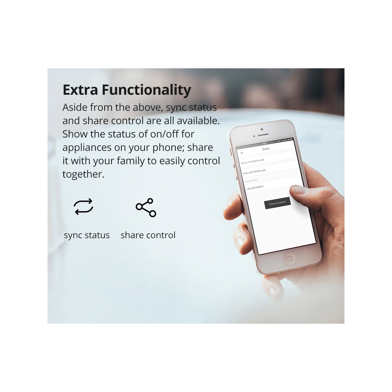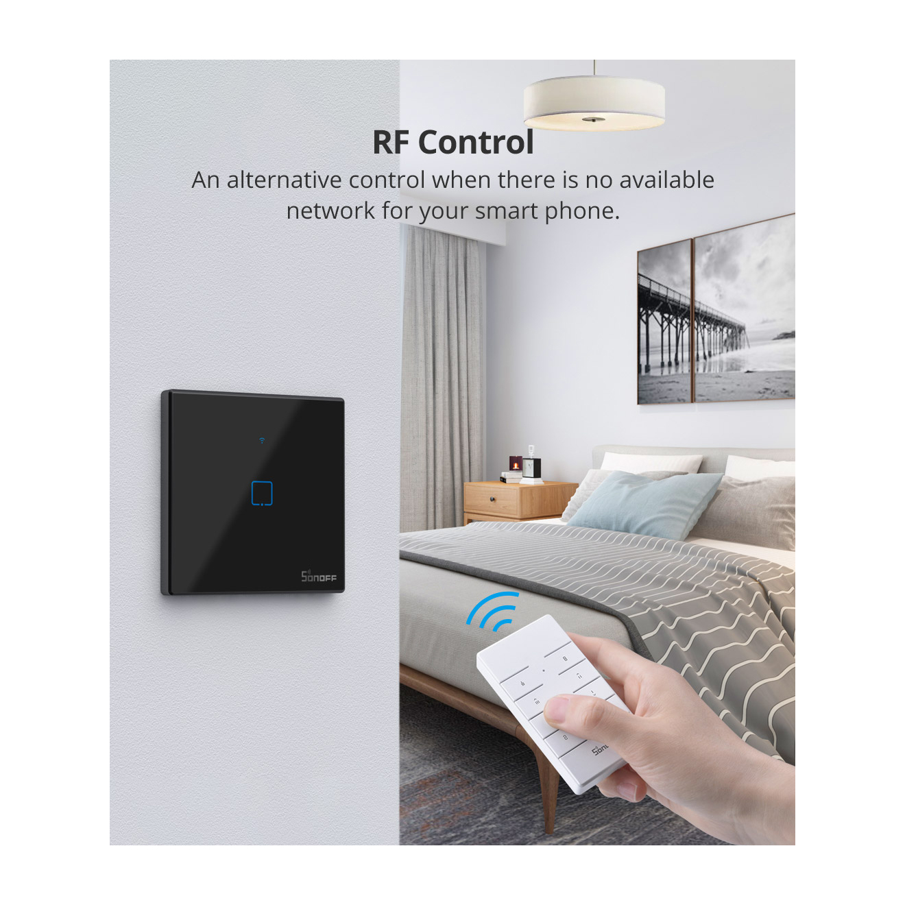 Διαθέτει ενσωματωμένο WiFi module και σας προσφέρει την δυνατότητα απομακρυσμένης της συκσευή σας (ενεργοποίηση/απενεργοποίησης - On/Off) αλλά και έλεγχο της κατάστασης της, απευθείας στο κινητό σας, μέσω της εφαρμογής eWeLink, όπως όλα τα WiFi προϊόντα της Sonoff. Παράλληλα μπορεί να υποστηρίξει έξυπνα σενάρια Smart Scene σε συνεργασία με άλλα ασύρματα περιφερειακά της Sonoff (ασύρματες μαγνητικές επαφές, ραντάρ, κλπ).
