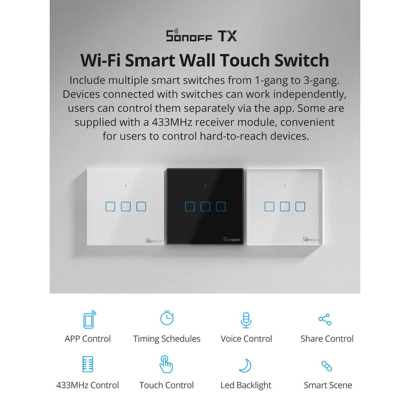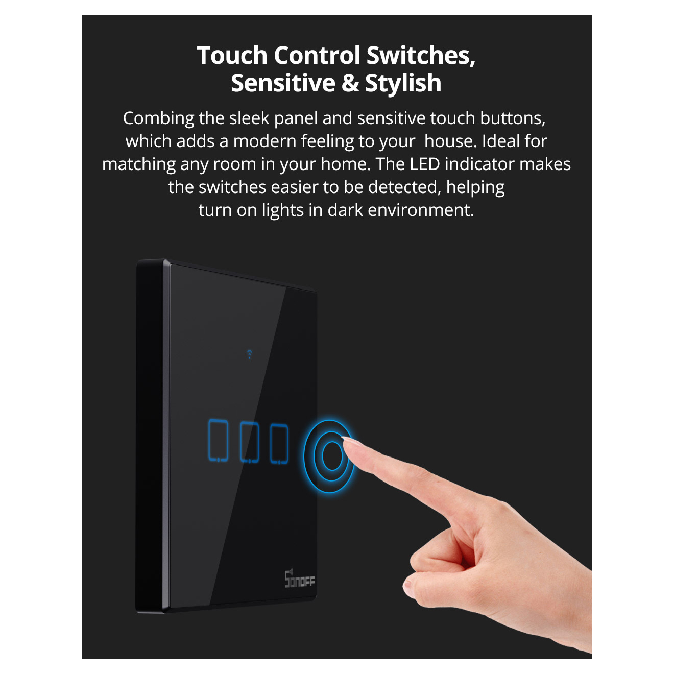 Sonoff T0EU1C-TX έξυπνος WiFi διακόπτης τοίχου (Wi-Fi Smart Wall Switch) για να κάνετε το σπίτι σας ''έξυπνo'' εύκολα, γρήγορα και οικονομικά. Μπορείτε να χειρίζεστε απομακρυσμένα μέσα από το smartphone σας οποιαδήποτε συσκευή επιθυμείτε όπως φωτιστικά, καφετιέρες, θερμαντικά σώματα κ.α. αλλά και απευθείας από τον διακόπτη όπως ένας κλασσικός διακόπτης αφής.