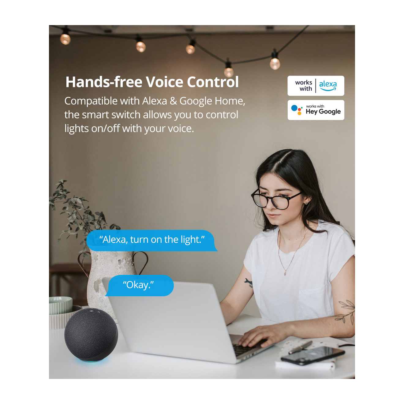 Η συσκευή είναι απόλυτα συμβατή με Amazon Alexa και Google Assistant, ώστε να μπορείτε να χρησιμοποιείτε τη φωνή σας για να ελέγχετε τις οικιακές σας συσκευές, απολαμβάνοντας μία hands-free εμπειρία