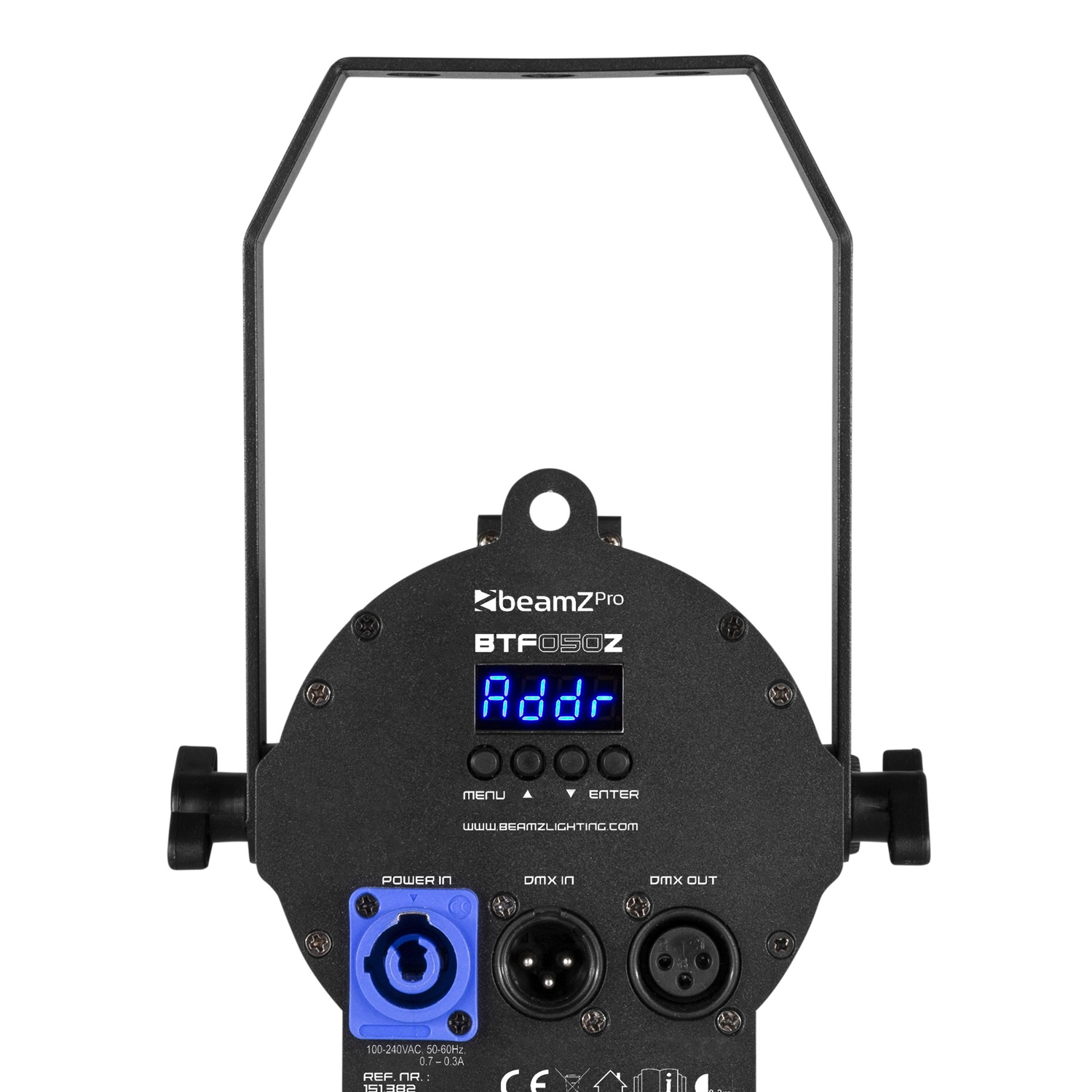 Η δέσμη φωτός παράγεται από χαμηλής κατανάλωσης COB LED και μεγάλης διάρκειας ζωή (περί τις 50,000 ώρες λειτουργίας). Το BTF50Z εξοπλίζεται με connector Powercon για τη τροφοδοσία και υποστηρίζει DMX (1, 2, 3 ή 5 Channels) με Connector DMX IN / DMX OUT. Φέρει ρυθμιζόμενα barn doors για να δώσετε σχήμα και κατευθυντικότητα στη δέσμη φωτός.