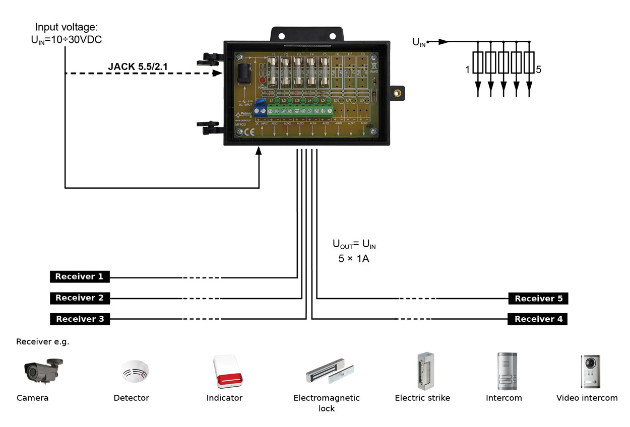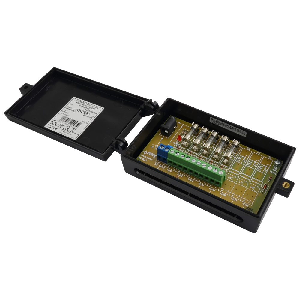PULSAR AWZ593 Πλακέτα Διανομής Τροφοδοσίας DC, 1 Είσοδος / 5 Έξοδοι, με γυάλινες ασφάλειες τήξης (5x1A)