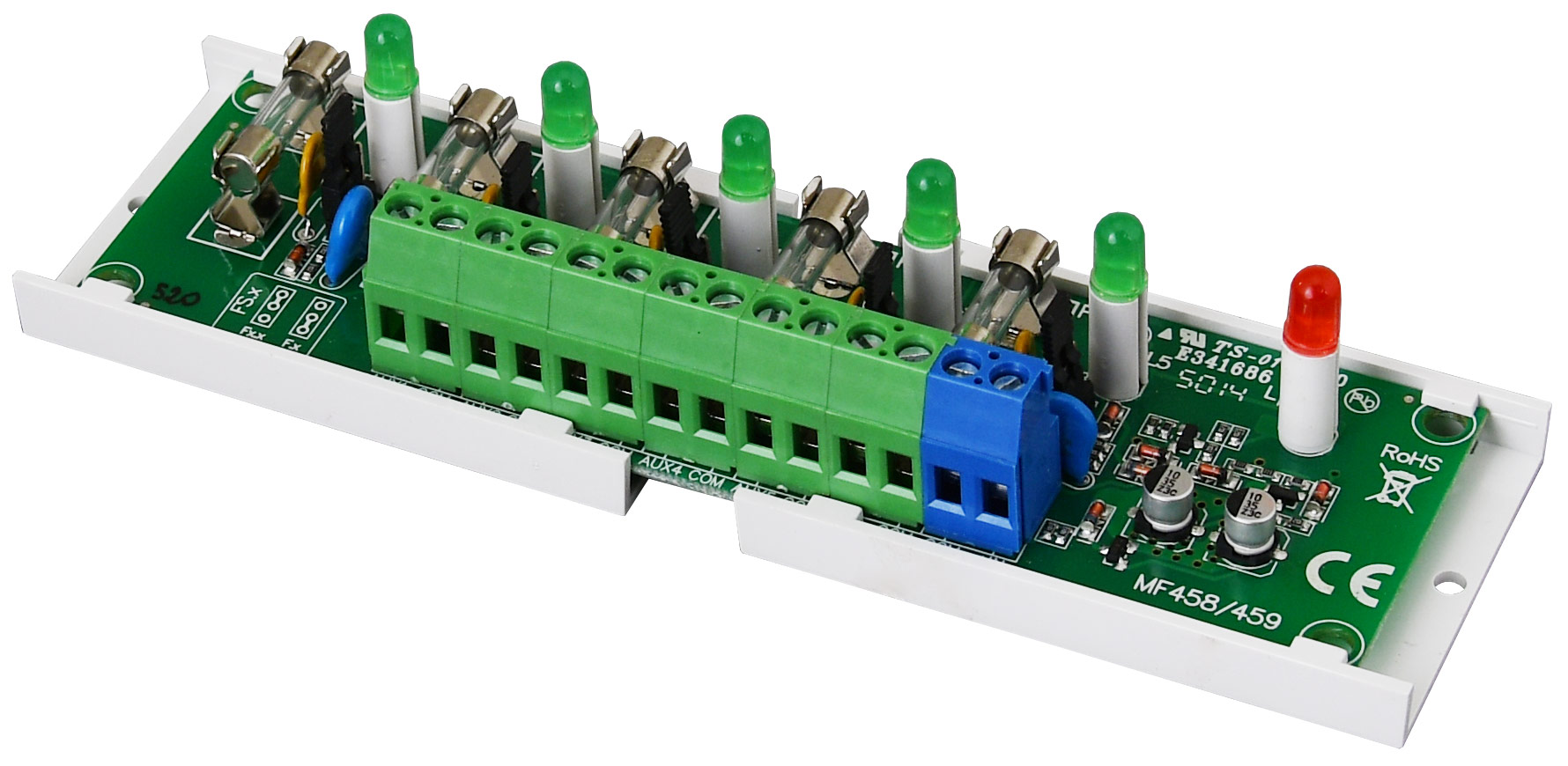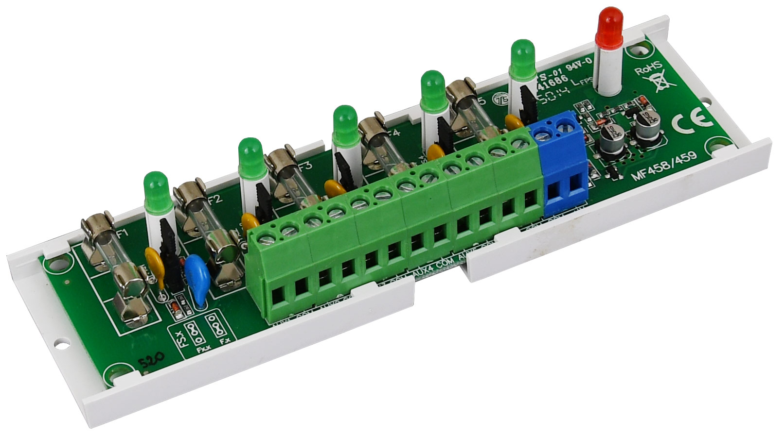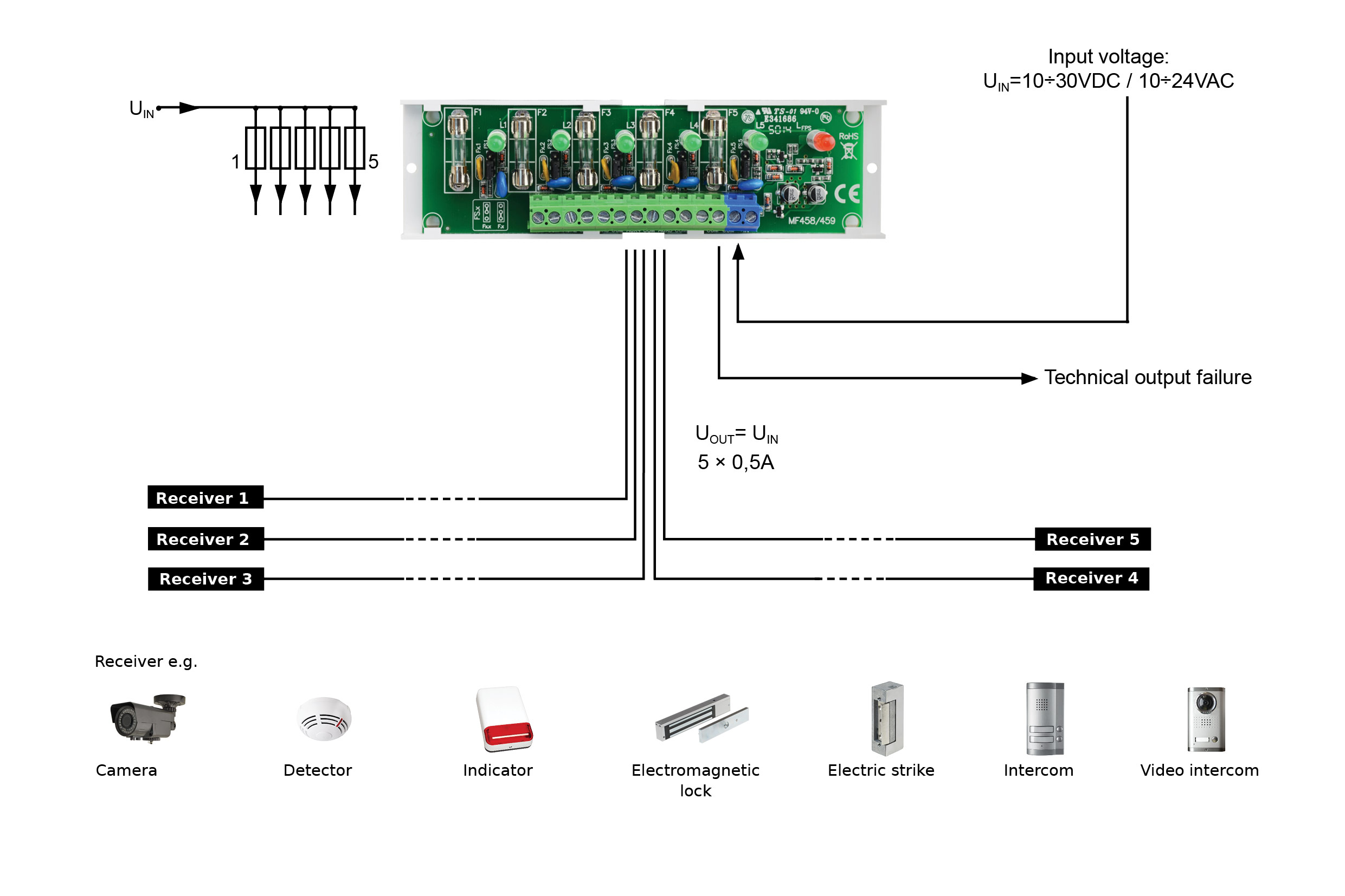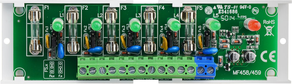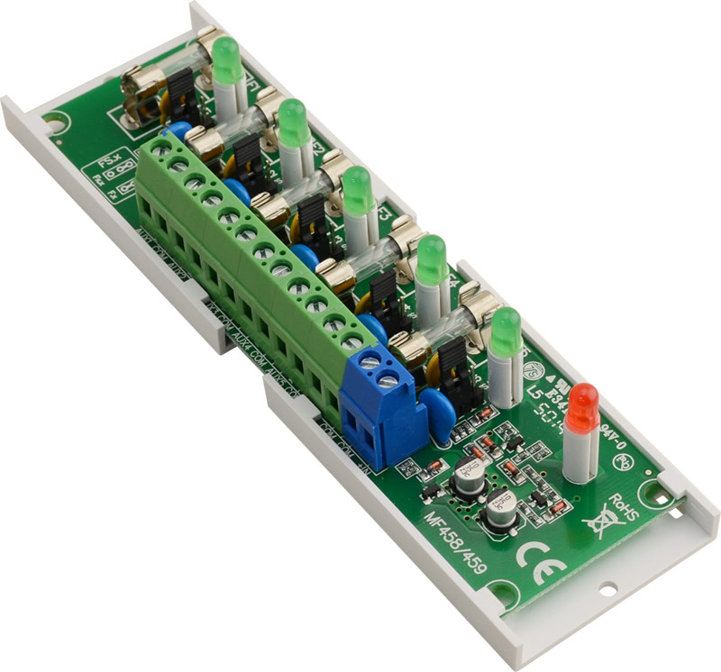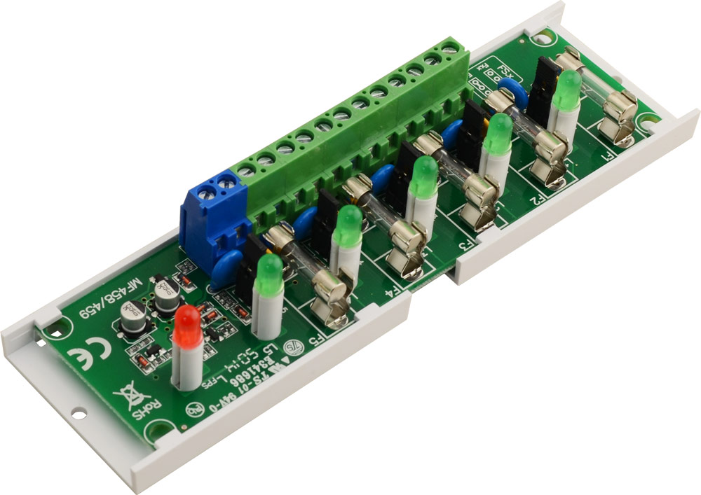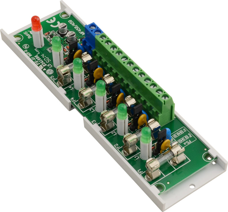 Επιπλέον διαθέτει ειδική έξοδο (FPS) η οποία θα ενεργοποιηθεί σε περίπτωση βραχυκυκλώματος οποιασδήποτε εκ των 5ν εξόδων. Διαθέτει πράσινη ενδεικτική λυχνία σε κάθε έξοδο, καθώς και κόκκινη ενδεικτική λυχνία βλάβης (FPS), για οπτική ένδειξη σε περίπτωση βραχυκυκλώματος.